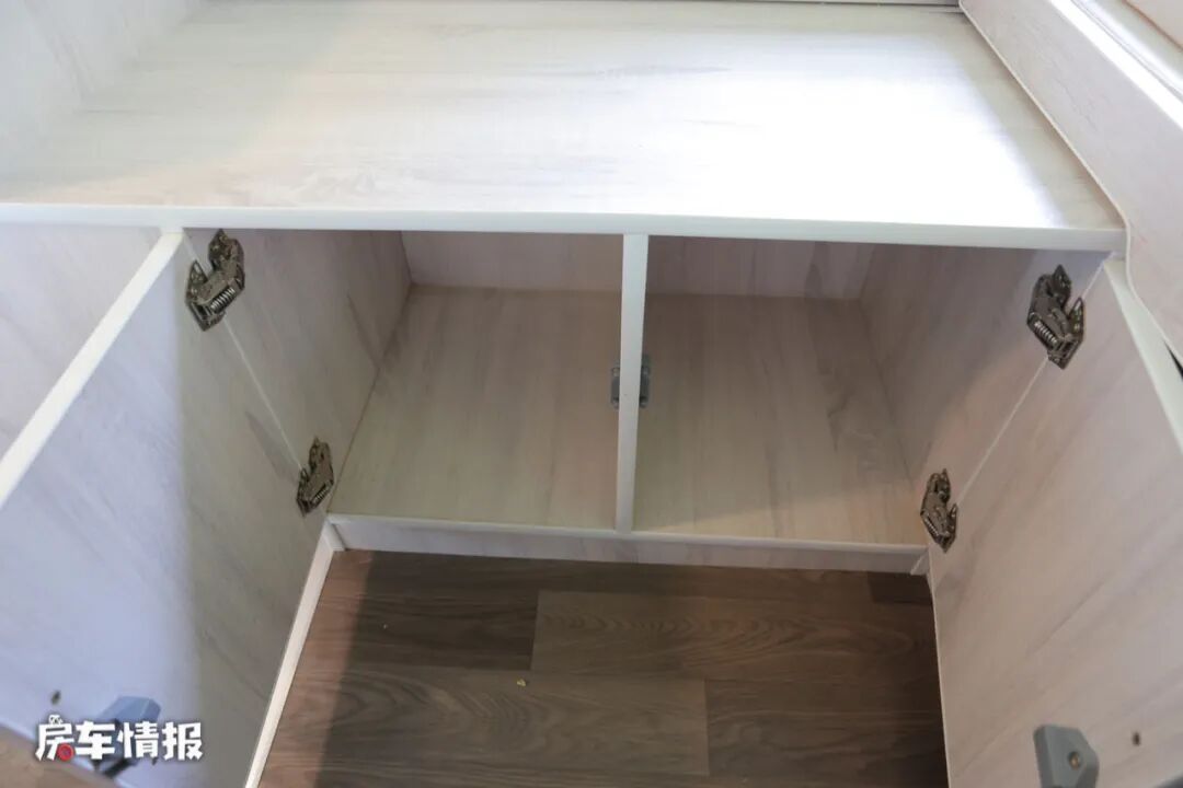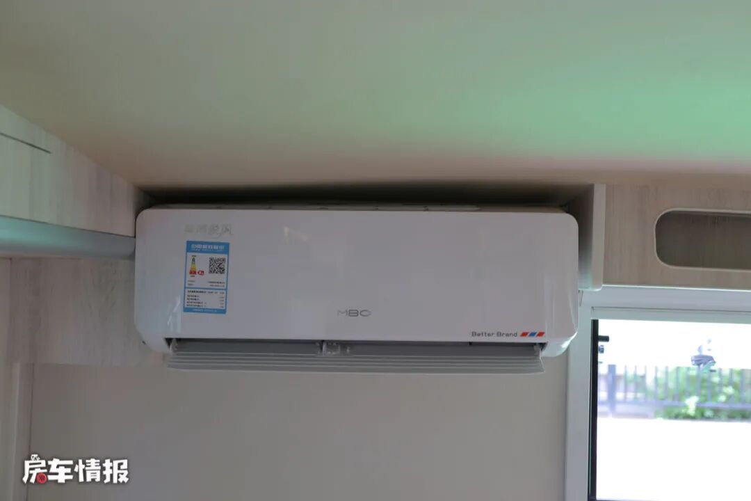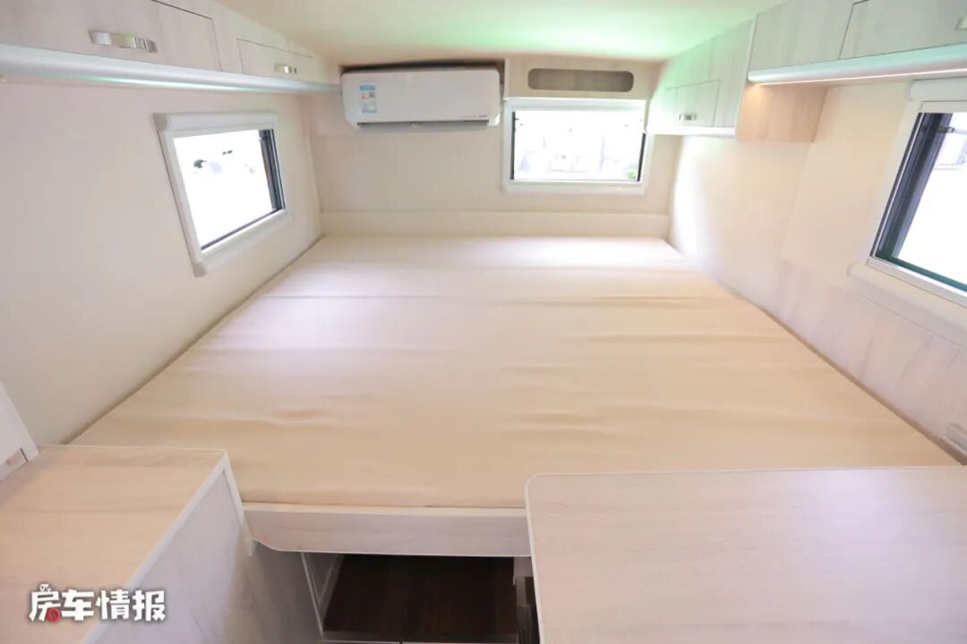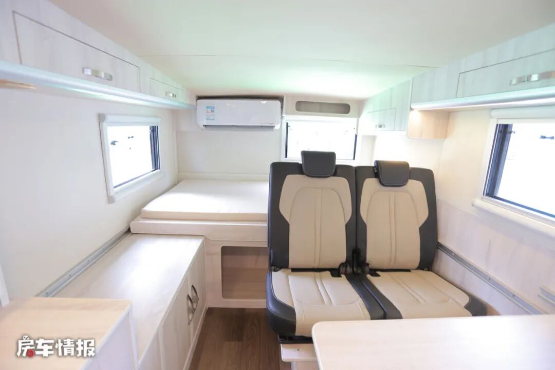 另外车厢两侧顶部都带有储物吊柜,可以存放一些平时的日常用品,尾部还带有一台家用变频空间,可以按需调节车内温度。
