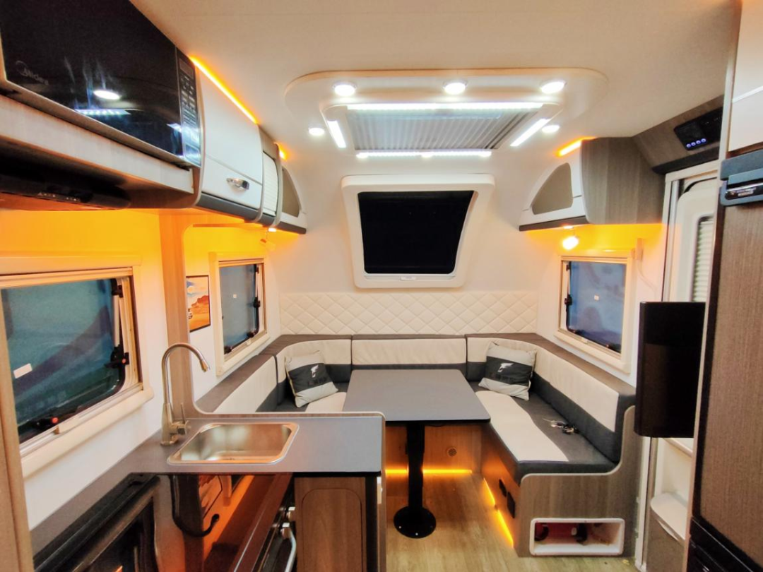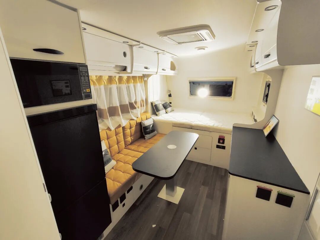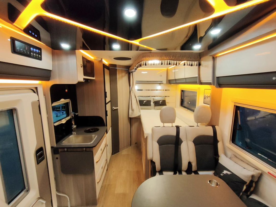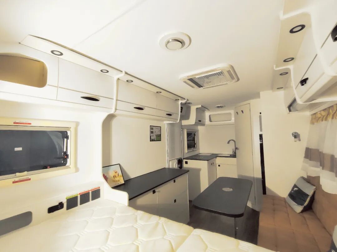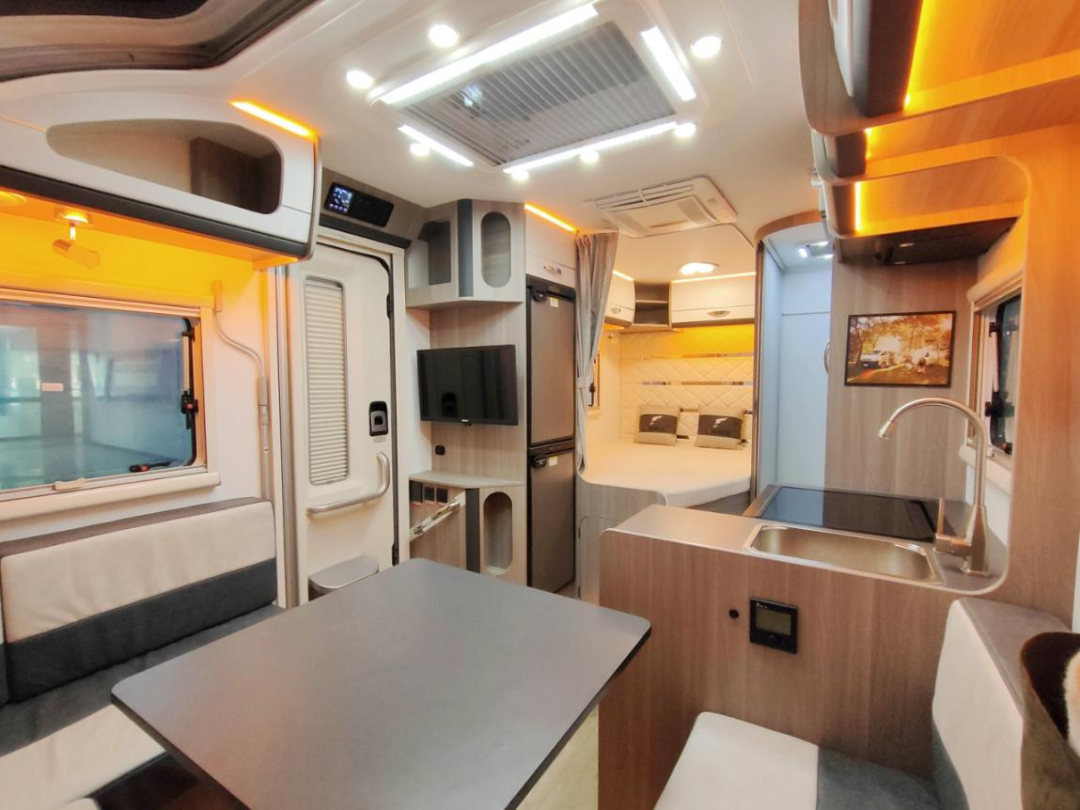 洛特F530系列在原有的设计上升级为更加的合理的布局,取消了子母床的结构并将厨房区域设计得更加符合人性化使用标准。车内系统特别设计了300W低功耗独立供电系统,环保快接水路以及12V400W太阳能匹配优质MPPT控制器。