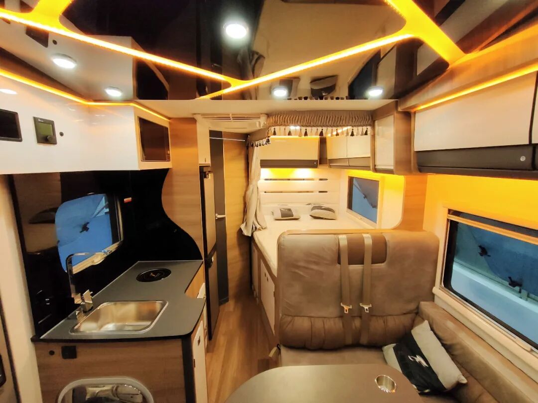内部吊柜采用德国菲林格尔的家具模块,装备2.5KG的韩国大宇洗衣机,多美达的顶置空调,燃油暖风热水一体机以及152L英德尔超大双区双温控直流冰箱。卫生间升级为全吸塑材质增加整体的质感和防水性能,内部带有LED化妆镜以及多美达的盒式抽拉马桶。飞神房车最经典的设计亮点得以保留——沙发区的顶部背景板是一张隐藏式电动升降床,可自由调节升降。