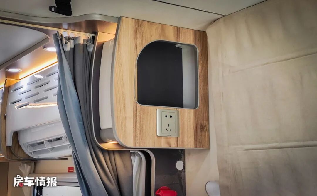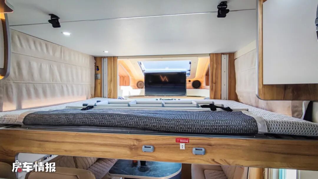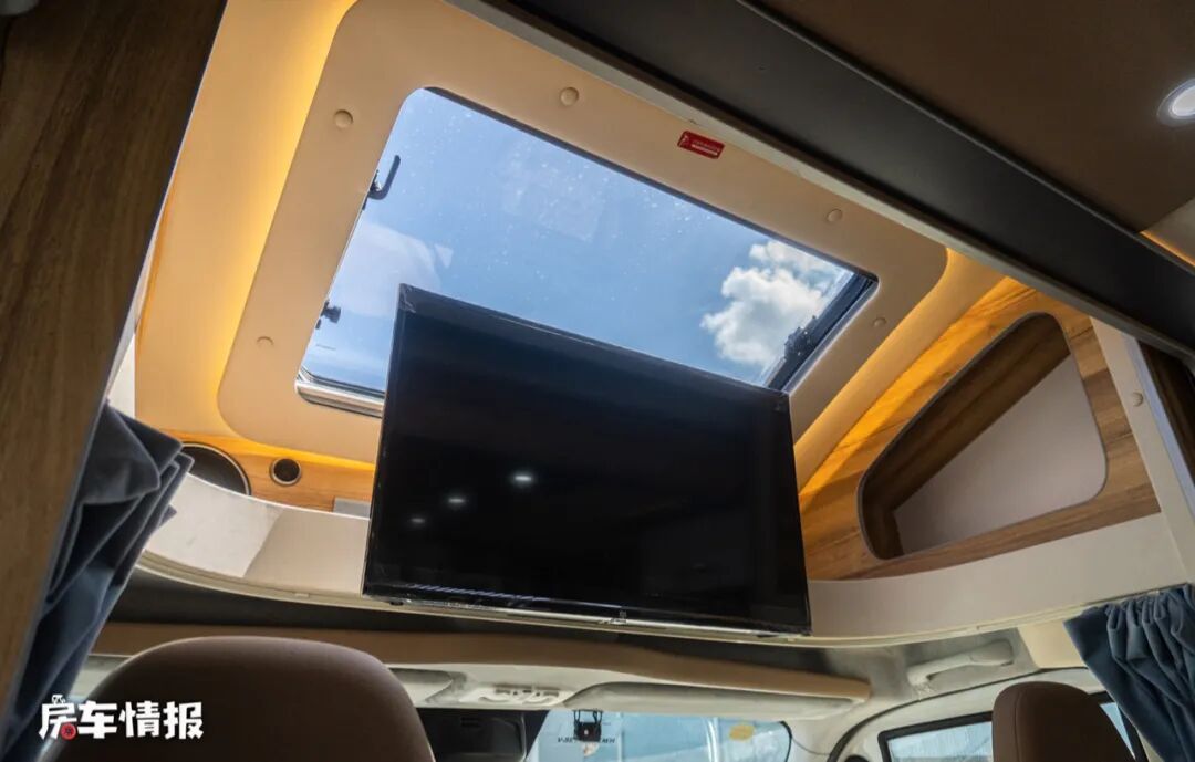 驾驶室上方因为采用了小额头的设计,所以取消了我们常见的额头床,取而代之的是一台32寸的网络电视以及音响,从而打造成了一个超强的影音视听区域。
