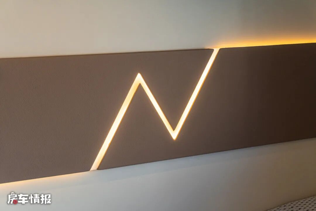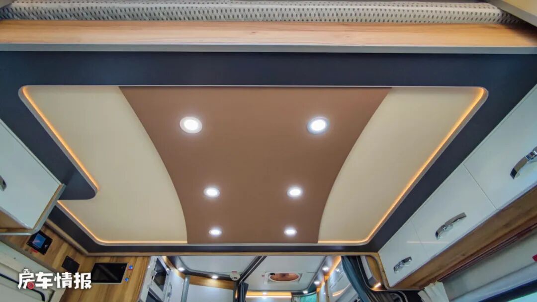 另外,在会客区顶部还设计了非常现代化的照明灯,整体设计也十分映衬车内的装修风格。
