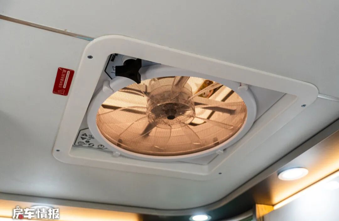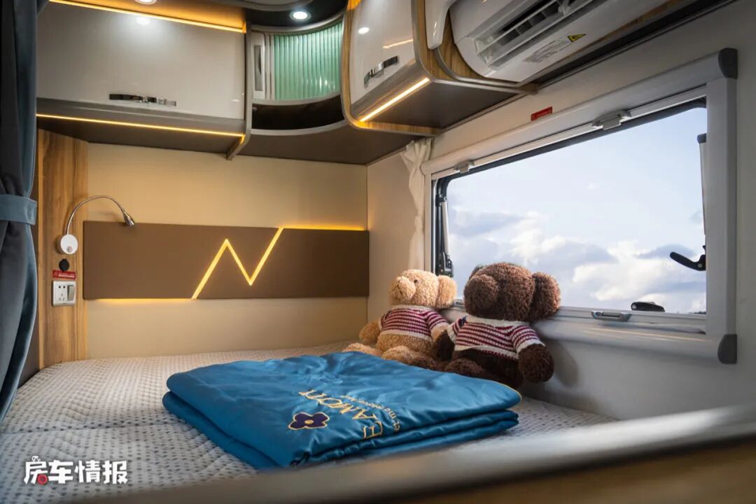 除去前方的升降床,在车厢尾部还提供了一张纵置的双人床,尺寸为1880*1200mm,也可以容纳两个成年人睡觉休息使用,床头处设计了新颖的灯光造型,同时上方提供了一圈L型的储物吊柜,平时储物的空间还是很充足的。另外在休息区的顶部还配备了一台进口的双向雨感的换气扇。