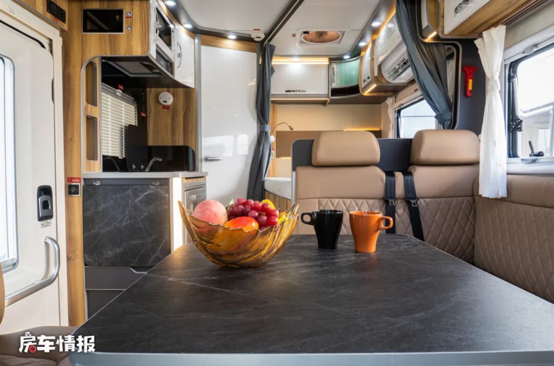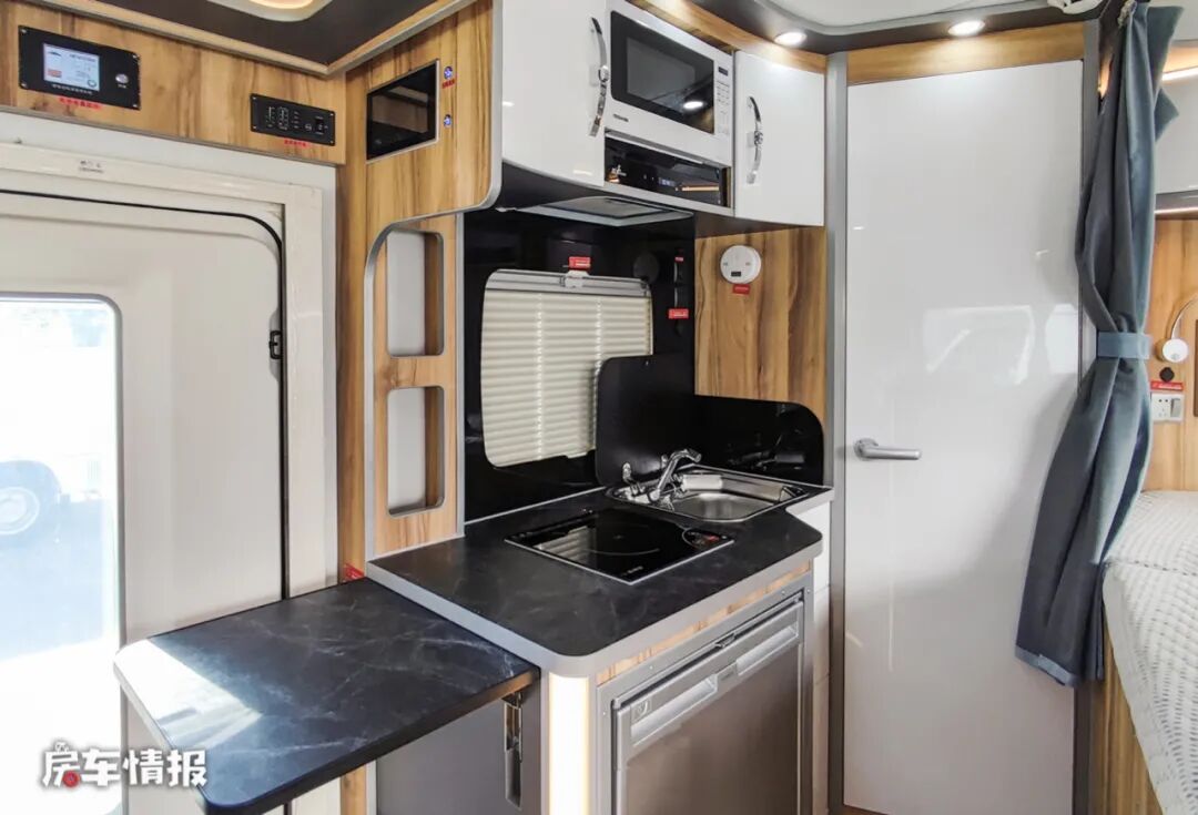 在临近乘客门的后方是全车的厨房操作台,台面上不仅带有电磁炉和翻盖洗菜池,并在侧面提供了一个可翻折的小桌板,可以增大整体的使用面积。同时台面下方提供了一台110L的车载冰箱,顶部也配置了一台微波炉,能够满足出行的烹饪需求。