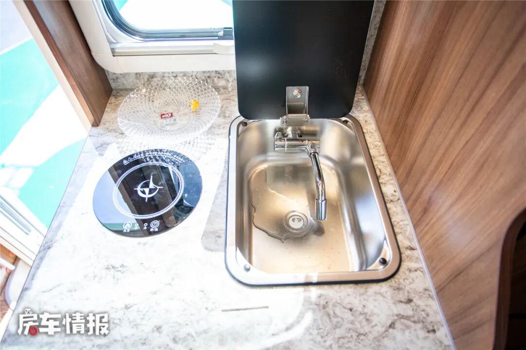 来到车厢后方的厨房区域,这里提供了电磁炉、洗菜池、微波炉、148L房车专用冰箱等基础设备,位于厨柜下方还提供了一台洗衣机,便于在旅行中清洗衣物。