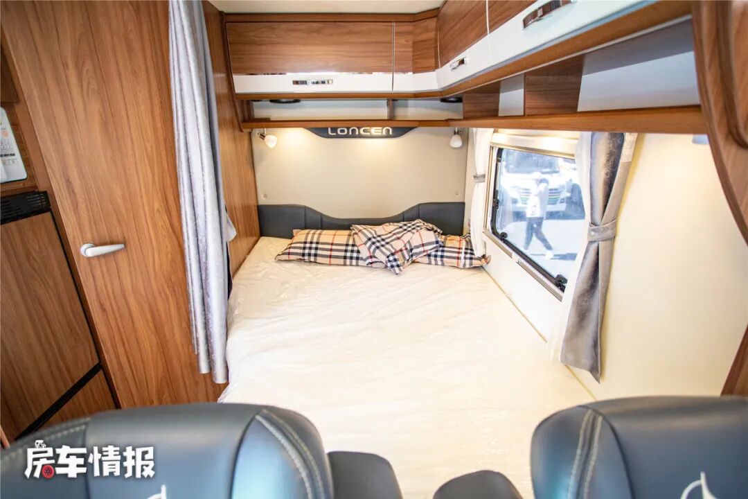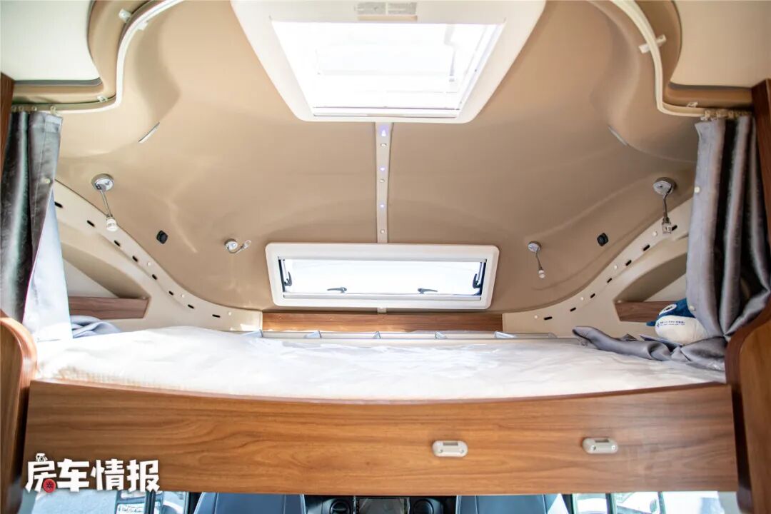 驾驶室上方是一张额头床,尺寸挺大达到了1500*2000mm,由于车顶隆起较高,内部空间表现很不错,再加上顶部的天窗和LED灯的装饰,让这里的舒适性得到很好提升。