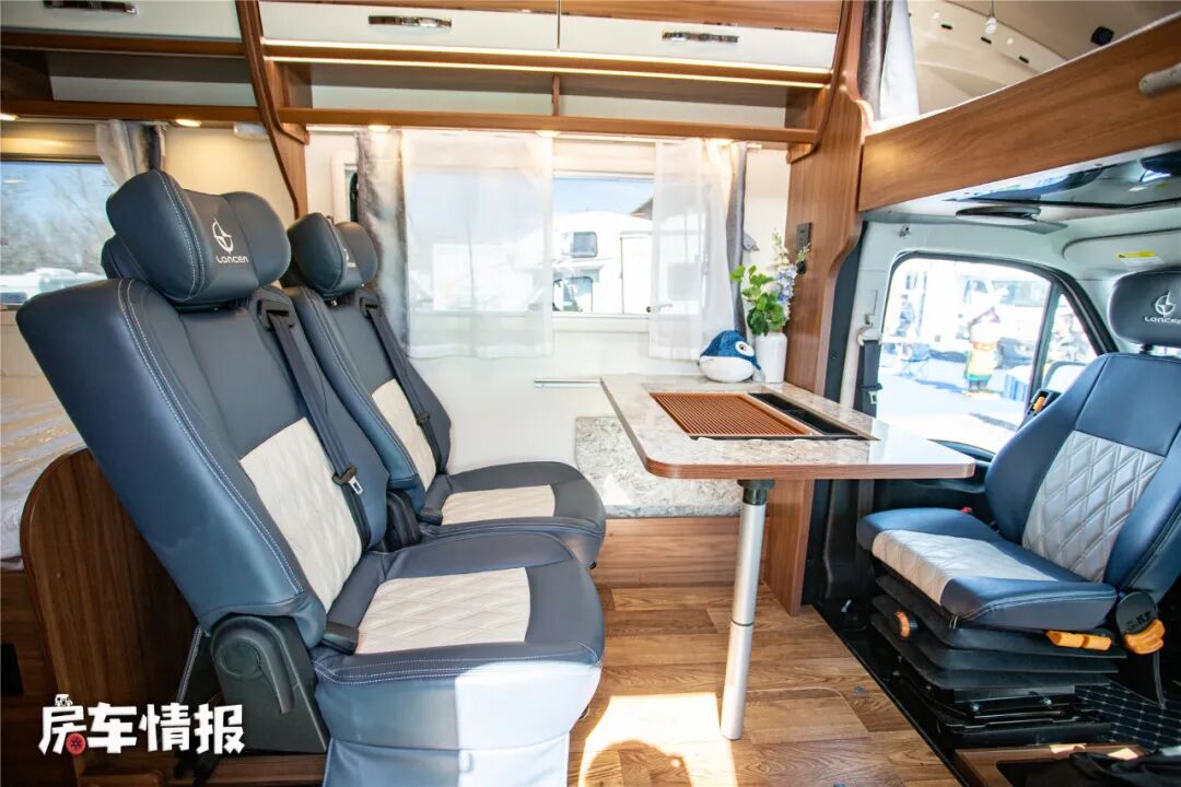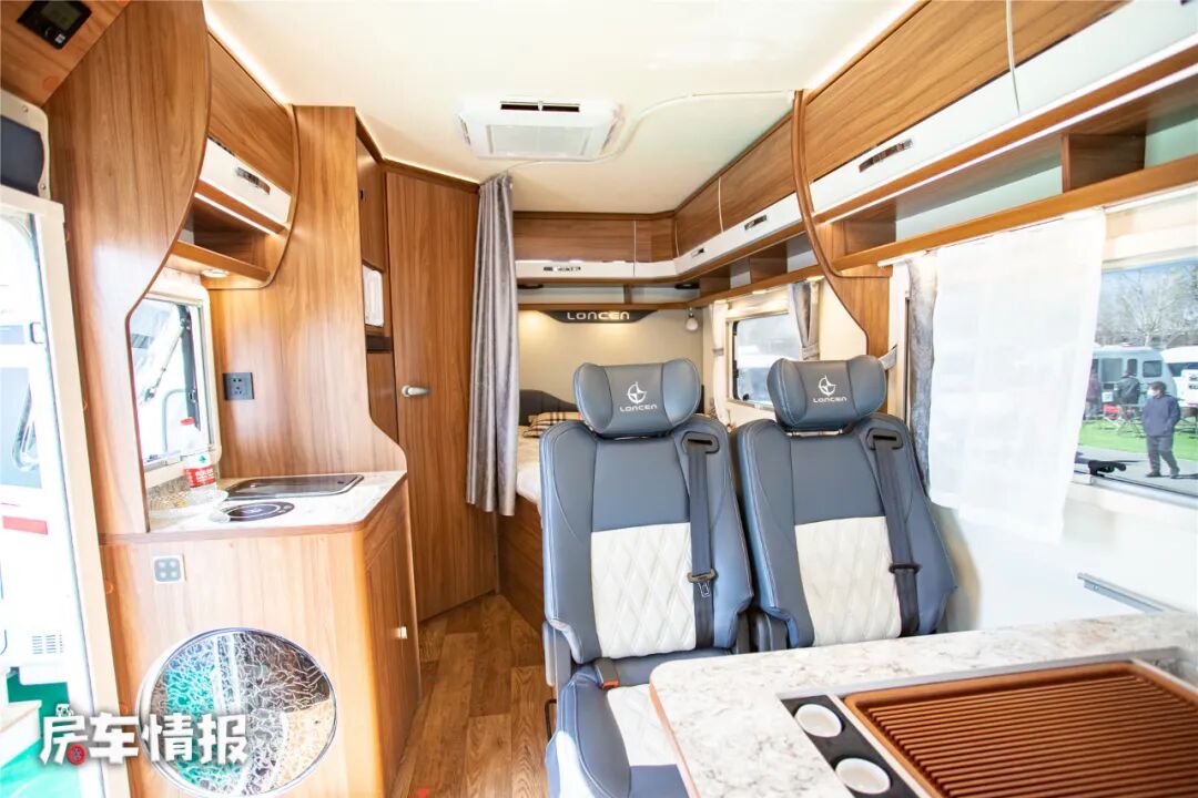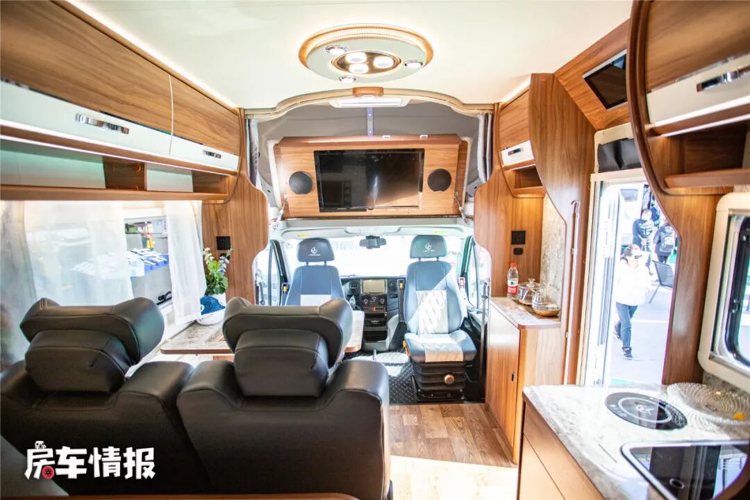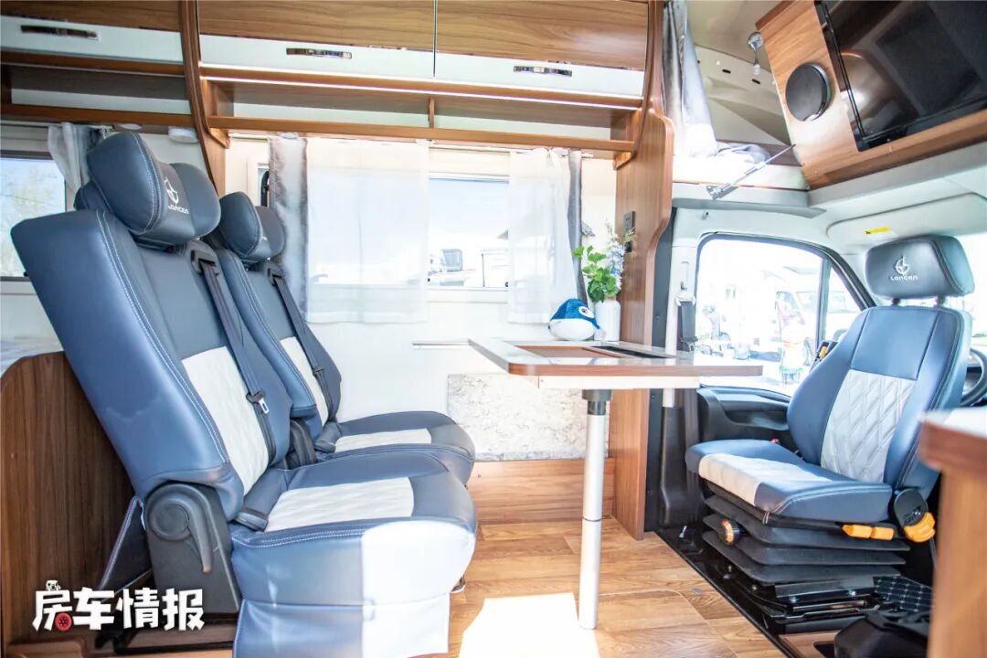 进入车厢内部,可以看到车内的整体布局相对来说较为常规,前方为会客区后方为厨房和主休息区,基本上和主流车型相当,一家4口人在车内活动没有问题,并且车内的整体配色和家具的做工处理的都比较细腻,很有德国人的严谨感。