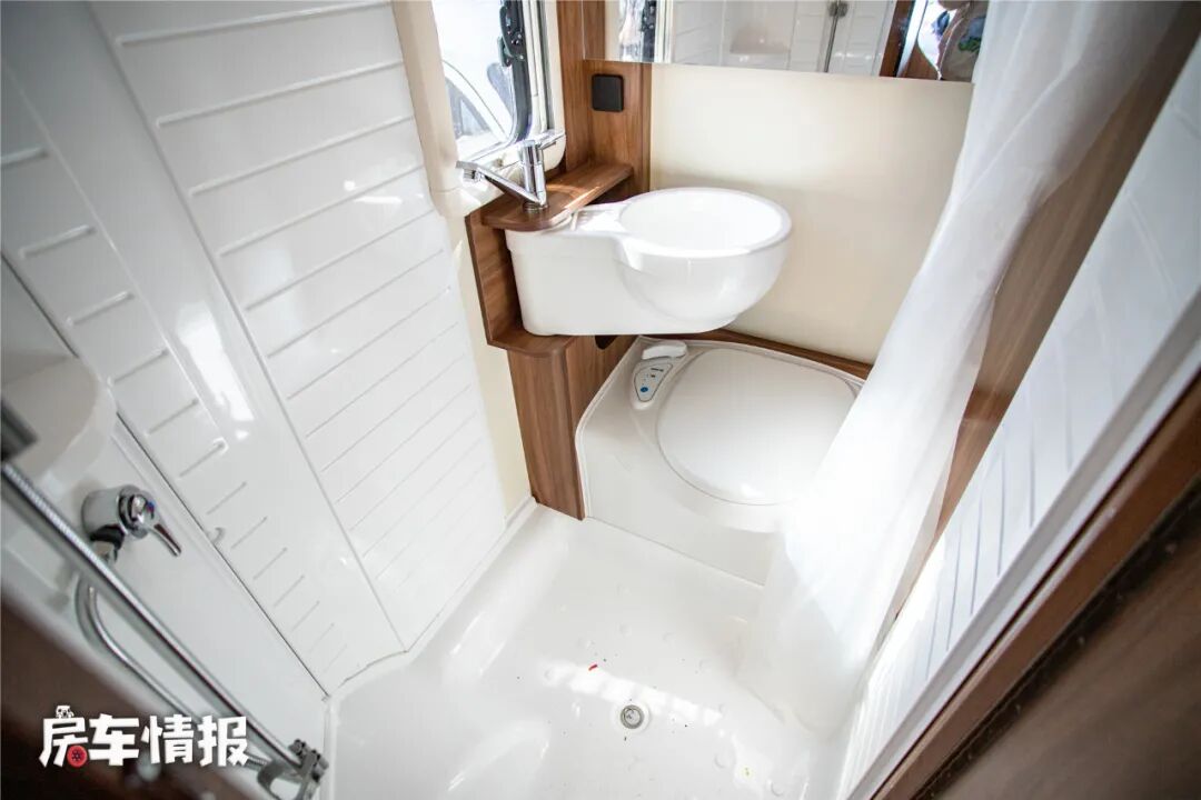 来到车厢尾部的卫生间里,空间整体表现不错,一体吸塑式的设计可以有效避免漏水,可旋转 的洗手池对于日常使用来说更加方便,内部的淋浴区域空间挺大,使用时可以拉上浴帘避免把马桶等弄湿。