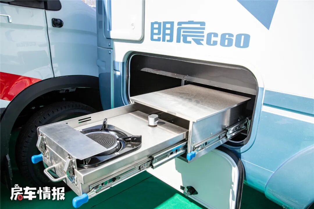 关于外部设备方面,这款车提供了3米手动遮阳棚、外置抽拉燃气灶、电动踏步等基础设备,基本上可以满足日常使用。