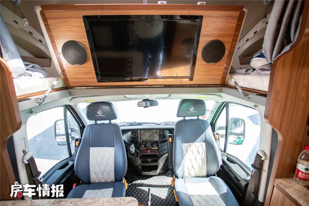 打开床板,下方是一台32寸液晶电视,搭配独立音响系统可以在车内营造出不错的视听享受,旅途中看个大片放松一下也是很不错的。