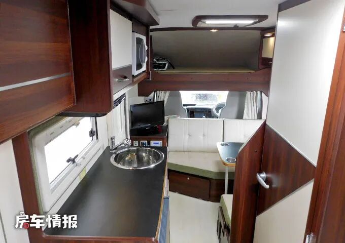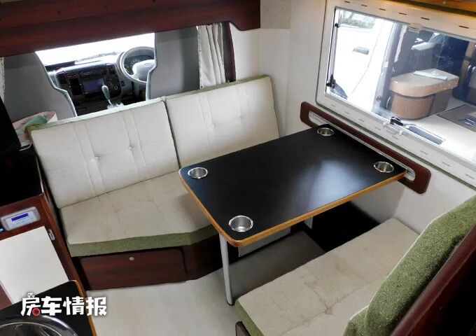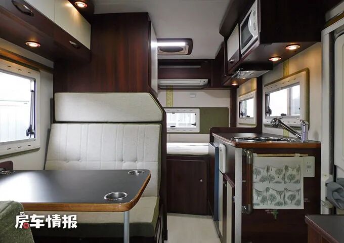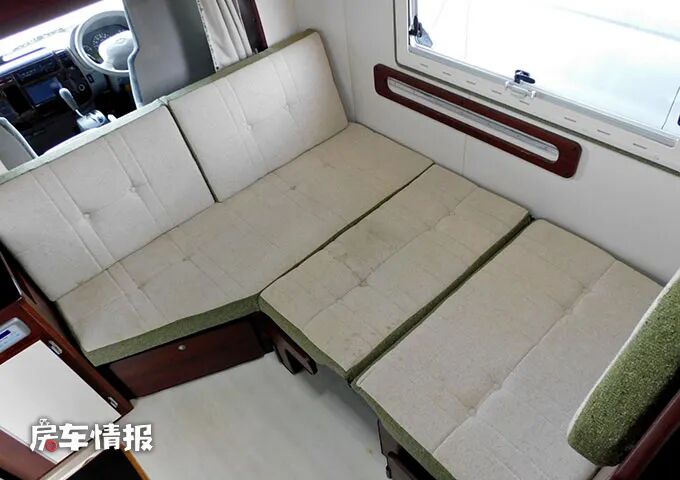 从车身左侧进入车厢内部,整体的布局还是日本房车内部常见的一个设计,采用了比较朴素的装修风格,分区也比较明确。