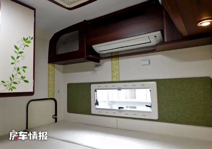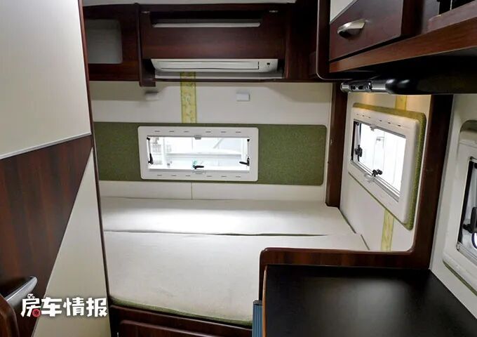 尾部的休息区内依旧是一张横置双人床的设计,上方还隐藏了一台家用变频空调以及镂空的置物架,侧面壁板带有大尺寸外推窗,为整个休息区带来了不错的采光度。