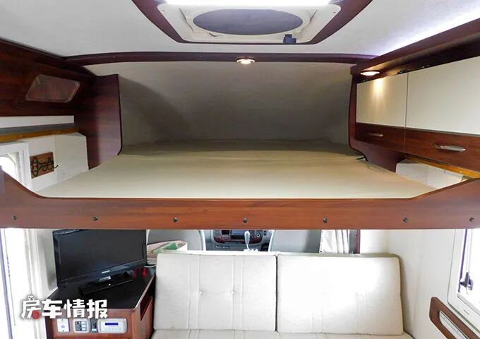 除去沙发床和尾床之外,在前方的流线型额头区域内也提供了一张双人额头床,虽然纵向空间有限,但因为带有拓展部分,也可以满足两个成年人的睡觉需求。