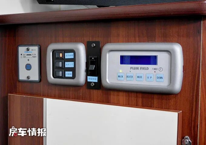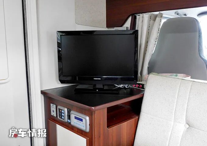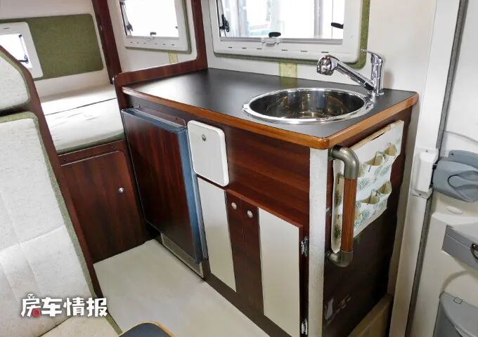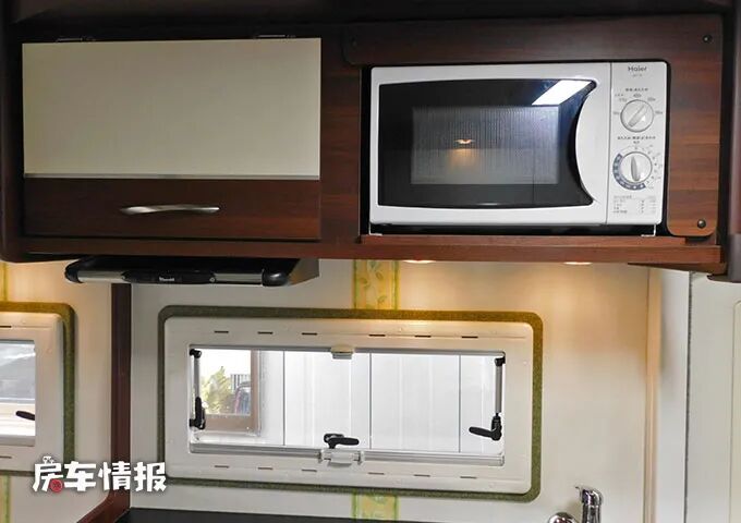 临近乘客门后方是全车的厨房操作台,整体的尺寸还算是中规中矩的,台面上配备了不锈钢水槽,匹配抽拉式的水龙头,下方则带有一台64L的车载冰箱,上方嵌入了一台微波炉,后期也可以使用便携式电磁炉或者卡式炉,满足最基本的烹饪需求。