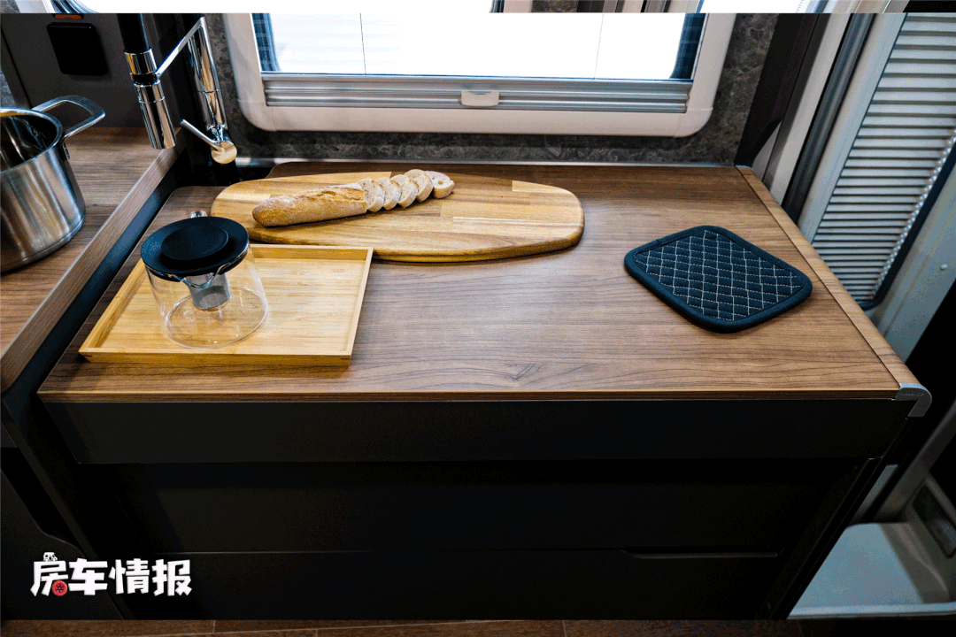 车内厨房位于单人航空座椅后方,尺寸不是很大,但功能却挺齐全,并且厨房操作台还有一个隐藏设计。常规状态下,这里就是一个普通台面,可以摆放物品,当需要做饭的时候,可以把上方操作台向右侧滑动,这时下方隐藏的洗菜池、电磁炉就可以使用了,并且此时的操作台就会固定在进门处,依然可以使用,设计挺巧妙,唯一不便的就是,这个时候就不能从后门上下车了…