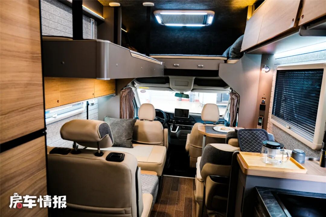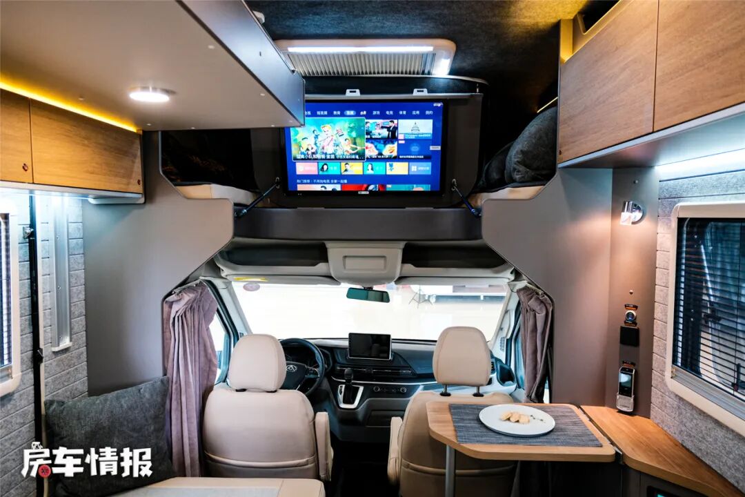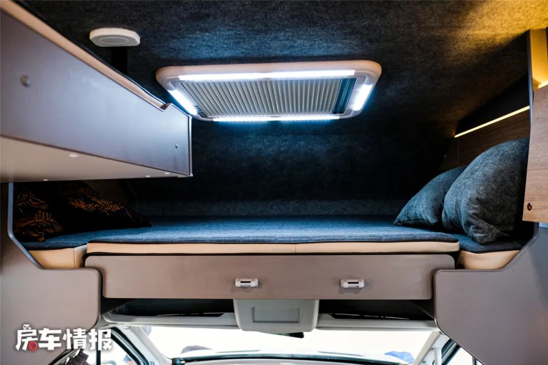 说到休息车内还提供了另外两个床位,其一是位于驾驶室顶部的额头床,尺寸约为2000*1500mm;其二是位于双人沙发上方的电动升降床,尺寸约为1900*800mm,如此一来整车可以满足一家四口睡觉休息。