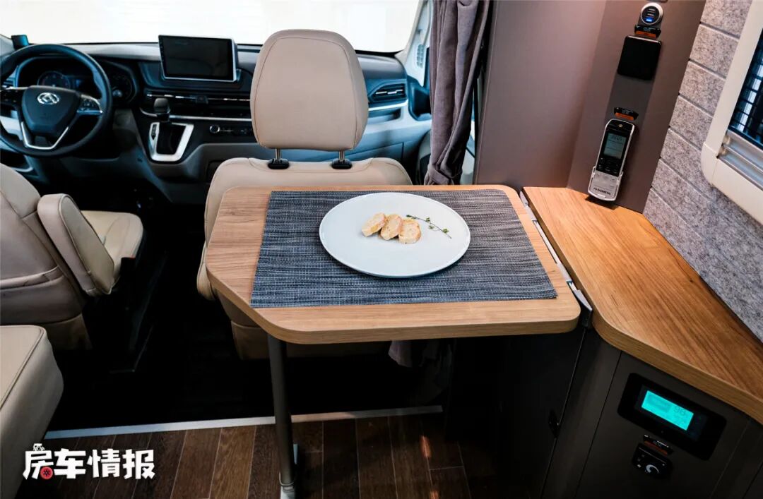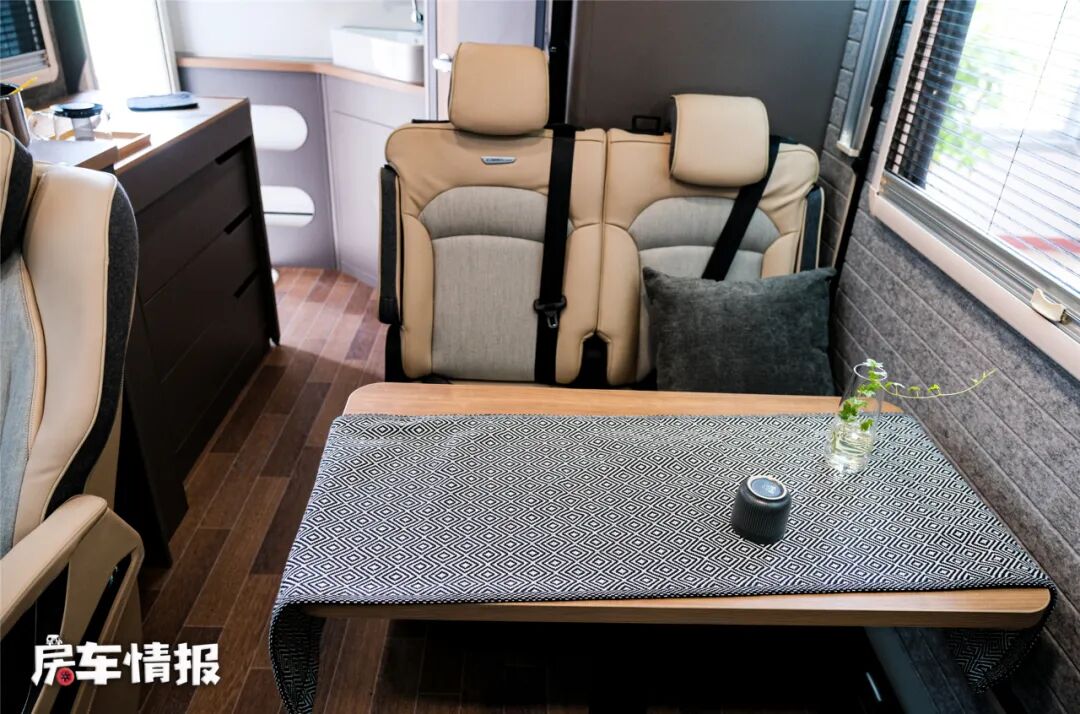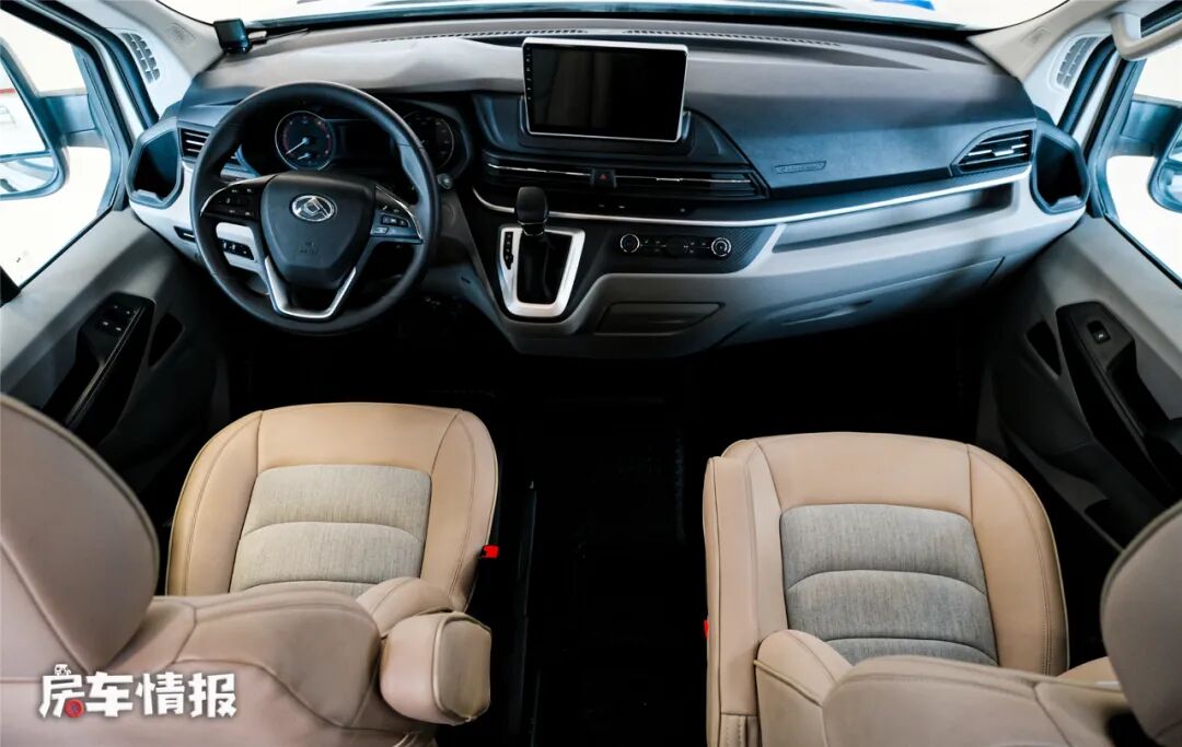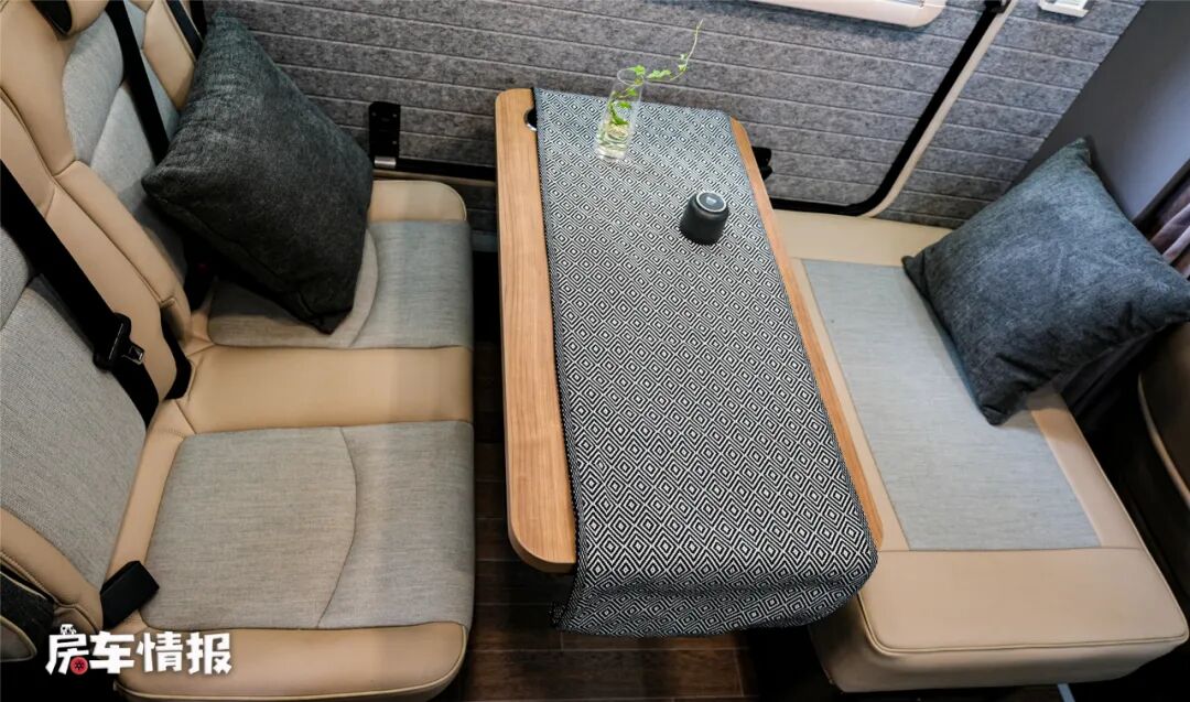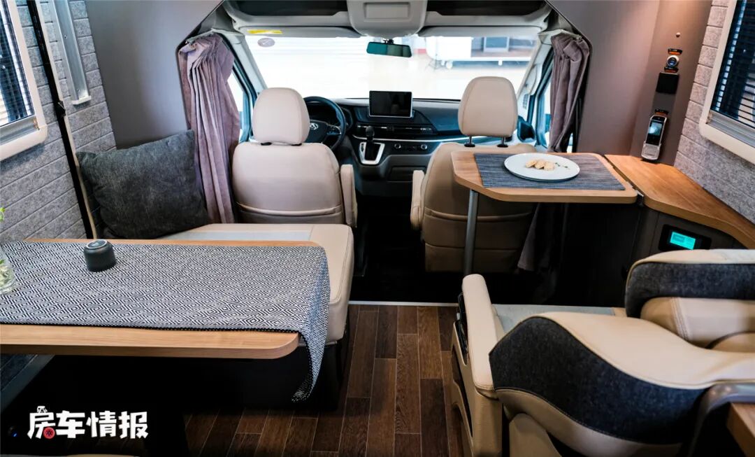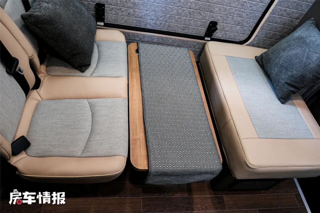 双人座椅均采用乘用车座椅,舒适性没得说,空间也挺大,另外在前方还提供一个类似换鞋凳的设计,由于这里没有安全带,行车时是不可以乘坐的,但可以把腿放在上边放松一下,另外驻车以后也可以当作座椅使用。