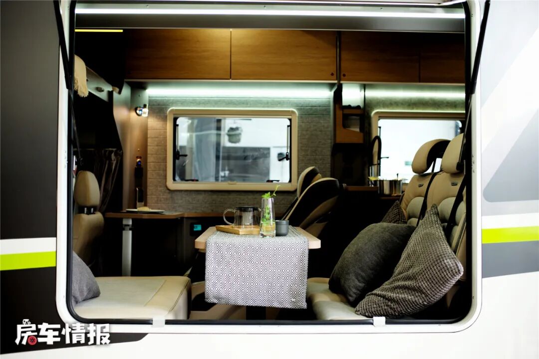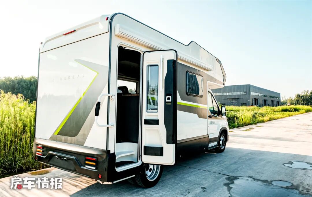 进入车厢内部前,可以看到这款车采用的是一个后入门的方式,在我的印象中,设计成后入门的房车,内部布局基本上都是尾部厨卫、客厅条形沙发+四人对坐沙发的布局,不过当进入车内以后,才发现这款车的设计十分有新意。