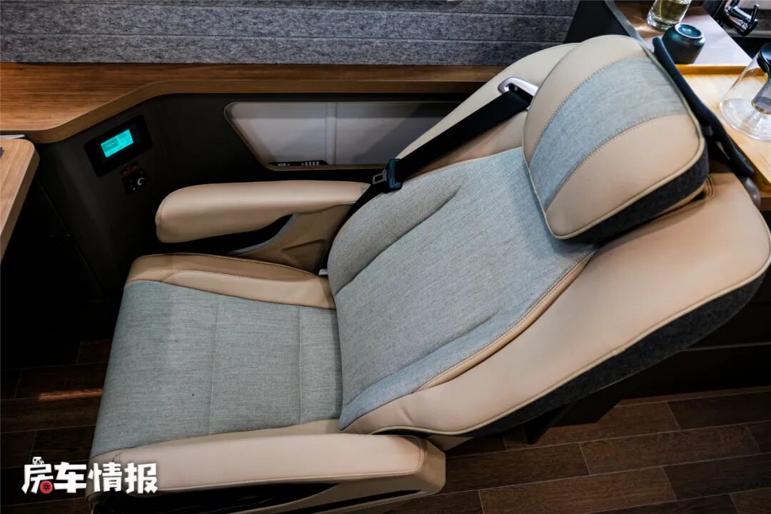 另一侧的单人沙发,采用的航空座椅,设计师给这里定义为“咖位”座椅,目的是让同行人员中需要受到照顾的那一位坐在这里休息,更大的空间、更舒适的座椅,可以提供更轻松的乘车体验,位于座椅前方还提供了一张隐藏折叠小餐桌,设计得挺贴心。