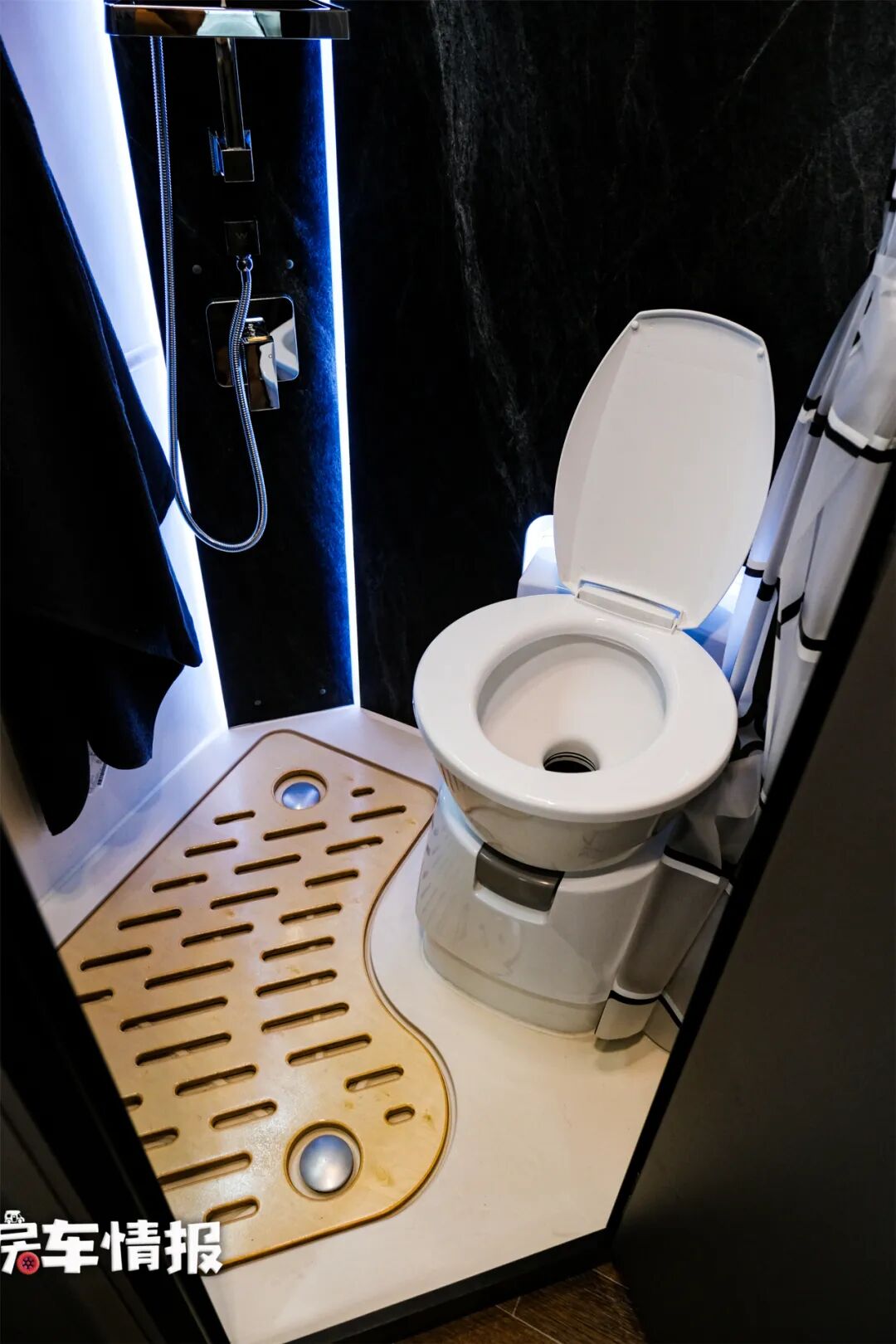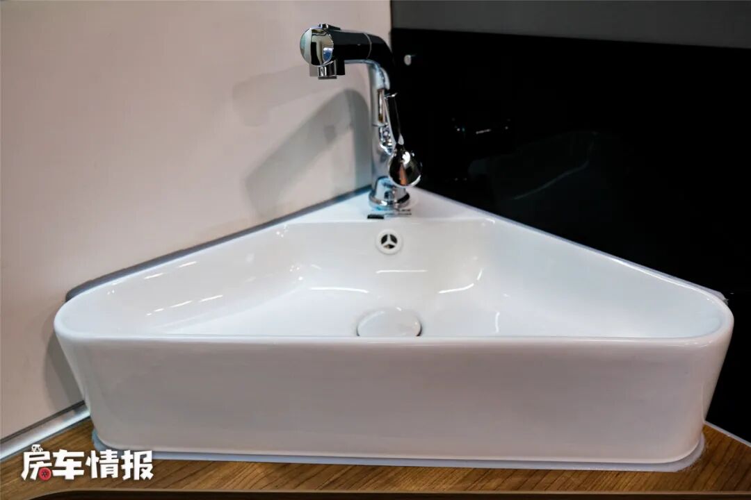 位于车位门处提供了一个外露的洗手盆,平时可以在这里简单洗手,节省了车门处的空间,淋雨如厕采用的是独立空间,同样位于车尾处,内部空间不错,提供了独立淋浴、盒式马桶等,基本上能够满足日常使用。