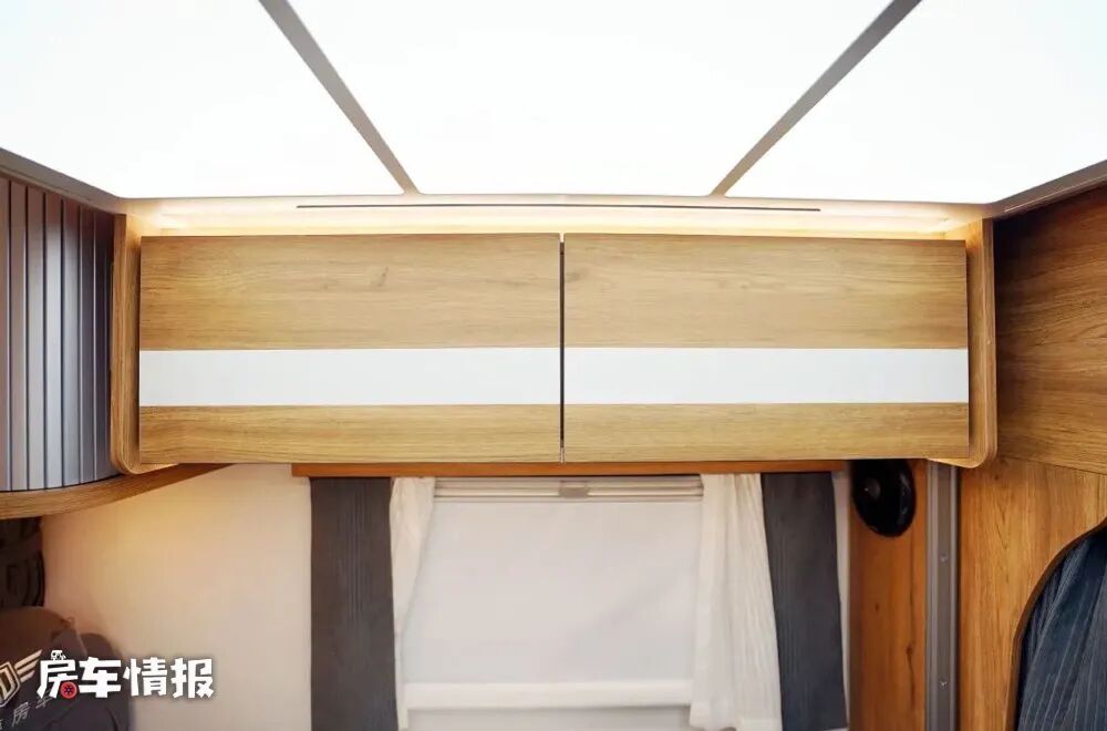 这款房车的休息区是采用了纵置双人床的设计,而且使用了乳胶床垫,更适合长期旅行使用。整体尺寸也能够满足两个成年人的睡眠需求。顶部还提供了一圈L型的储物吊柜,提升整车的储物能力。床板下方依然是带有一台洗烘一体的洗衣机,满足基础的生活需求。