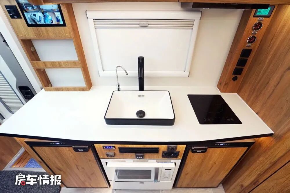 乘客门后方的厨房区也是这款车型的一大亮点,与以往我们常见的厨房操作台不同,加入了造型设计的厨台更加美观,尤其是上方的台盆并不是不锈钢材质的,而是造型更加美观也更精致的亚克力材质,同时因为全车配备3M净水过滤系统,所以带有直饮水功能。