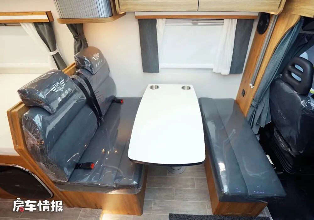主驾驶座椅后方是整车的会客区,不过车主并没有选用此前官方所使用的双人航空座椅,而是变成一张普通双人座椅,另外在餐桌前方还加入了一个小尺寸条凳,虽然行车时不可以乘坐,但方便后方人员把腿放在上边休息,驻车以后可以充当板凳使用。