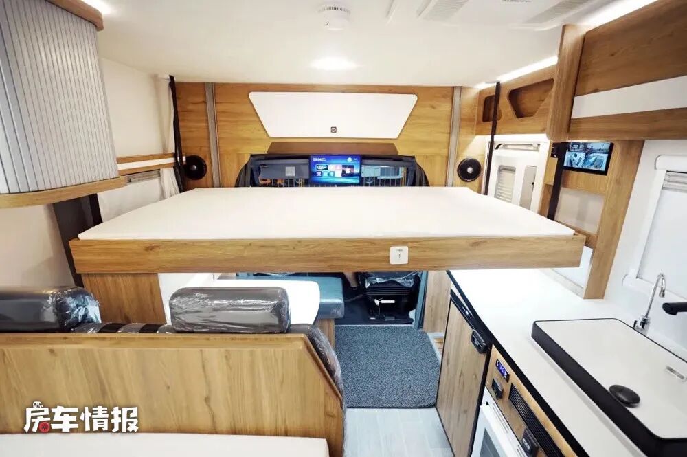 与常规版车型不同的是,这款定制款的房车在会客区的上方还提供了一张升降床,平时不需要的时候就紧贴在顶部,下方的照明灯也带有造型设计,既简洁又大方,到了晚上需要休息的时候就可以降下来使用了,整体尺寸也可以为两个成年人提供睡觉休息的空间,所以这款定制版的房车更适合一家四口使用。