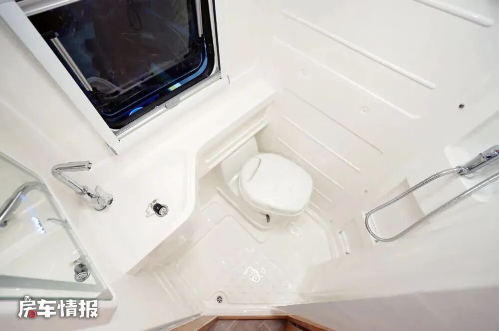 另外这款定制款的房车卫浴室采用了一体吸塑式的设计,不仅防水防霉,还可以延长使用寿命,也比较美观,内部配置也比较丰富,包括马桶、洗手盆、淋浴花洒、梳妆镜和换气扇等,完全可以满足出行的洗漱需求。
