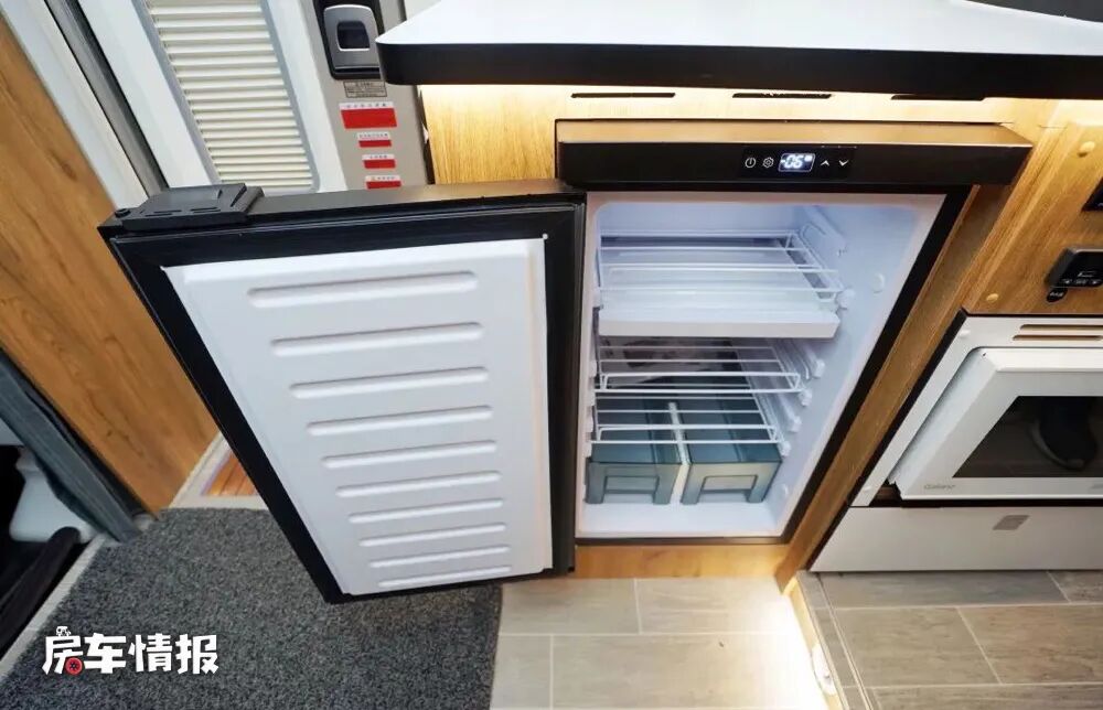 旁边则提供了一个电磁炉,下方带有一台微波炉,微波炉两边分别配置了一台76L的车载冰箱,可以单独的冷冻或者冷藏,满足生活所需。