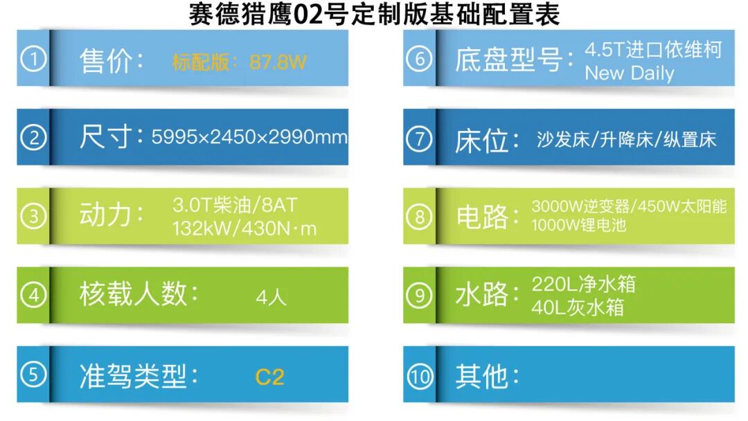 这款搭载4.5T进口依维柯New Daily底盘所打造的赛德猎鹰02号定制款房车,标配版本价格为87.8万元,如果后期您有需要,也可以选择定制适合自己的版本,这样就可以更符合个人的使用需求了。如果您想了解更多关于定制房车的事宜,也可以后台私信我们留下联系方式,那么下期再见~