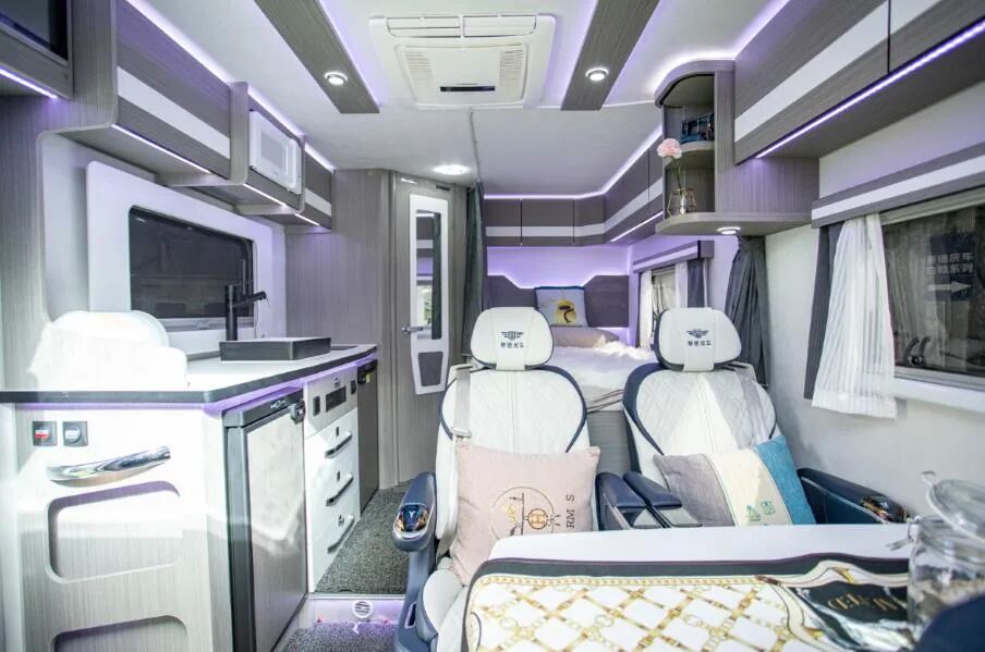 在电路上,这款房车搭载了一台3000W的逆变器,提供1000Ah的锂电池,同时在顶部还配备了450W的太阳能电池板,水路上则提供了220L的净水箱和40L的灰水箱,另外全车还提供了柴油暖风热水系统,可以更无忧更安心旅行。