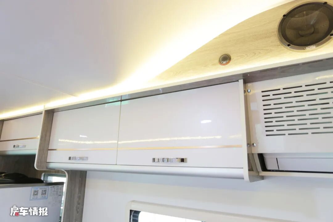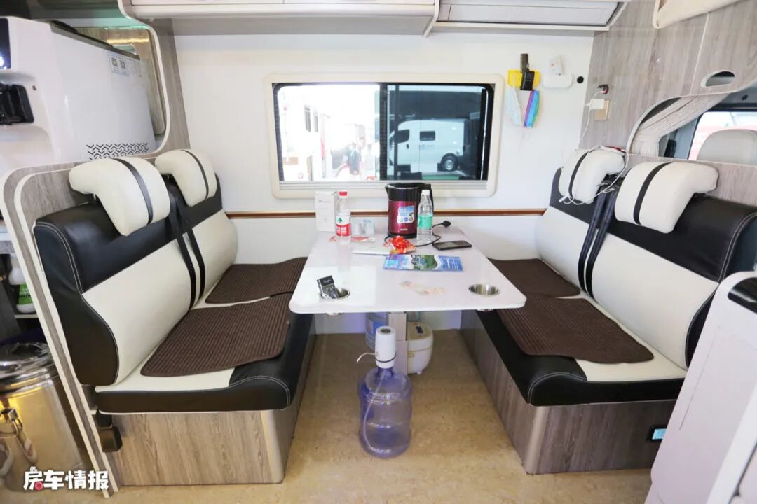 主驾驶后方的乘客区处同样采用了四人对卡座沙发+升降餐桌的设计,两排沙发座椅之间的距离也相当宽松,平时在这里就餐或者休息都是不错的选择。顶部还提供了储物吊柜和空调,满足生活的基本需求。