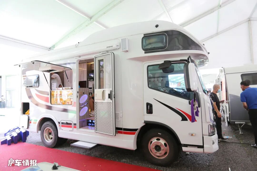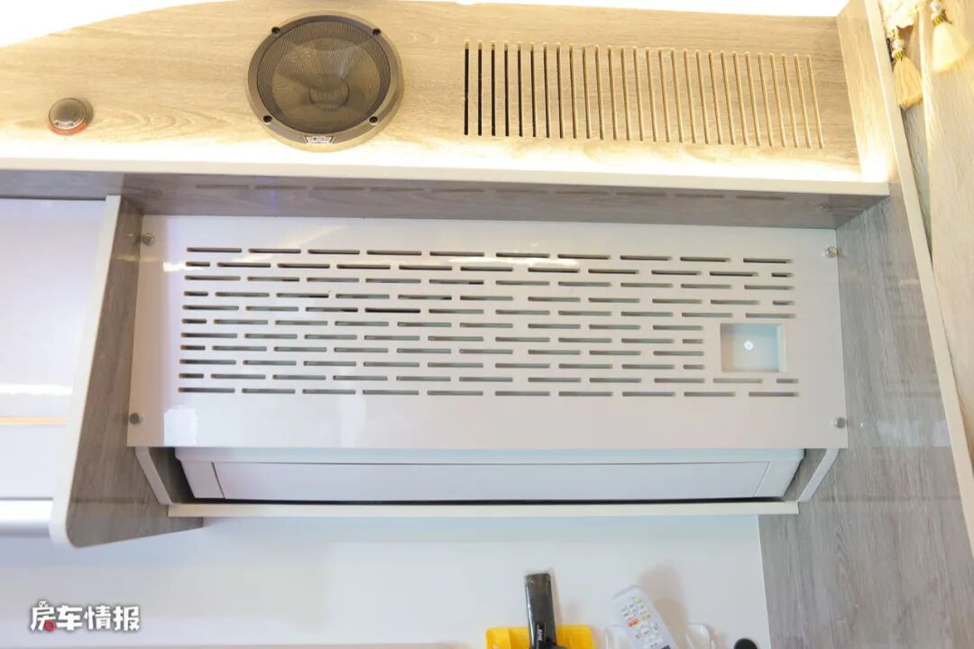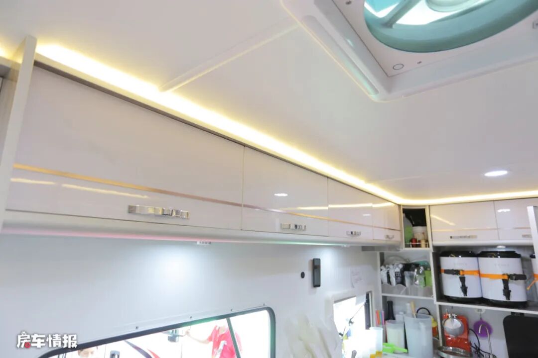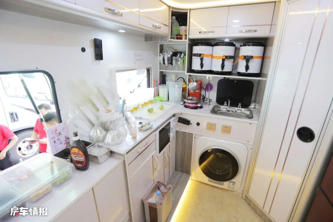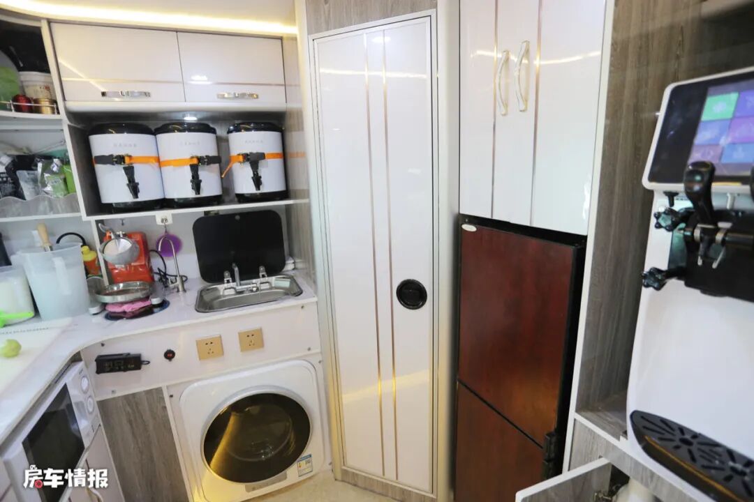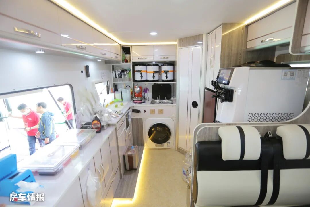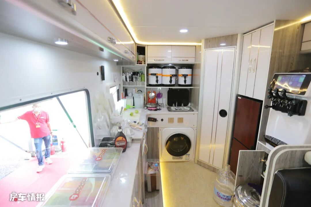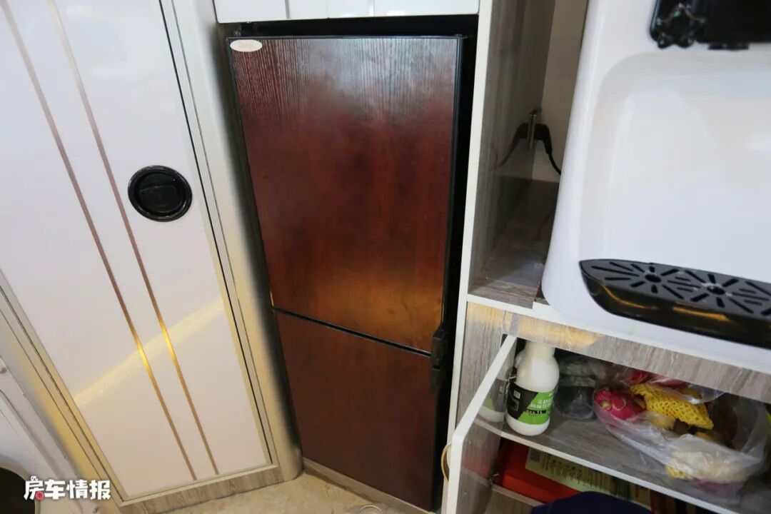 而副驾驶后方的区域则集合了储物柜和一台双开门的冰箱。说到这里可能感觉其实整体和咱们家用的房车差不多,但其实最大的不同是车后部,我们一起来看看~