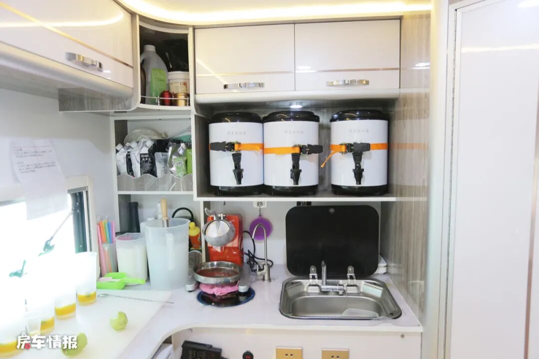 除此之外,这辆冰淇淋房车内部还提供了大量的储物空间,以保障制作材料的存储。