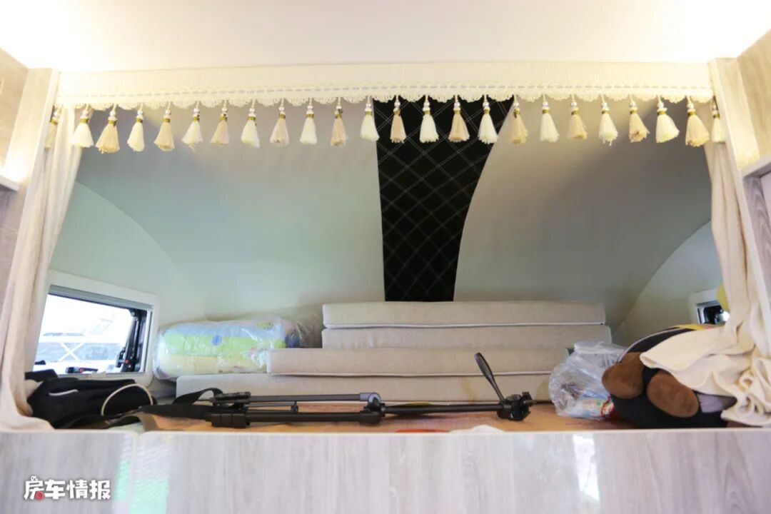 在最前方的驾驶室上方提供了一张额头双人床,可以满足两个成年人的睡卧休息需求,左右带有采光和通风的外推窗,提升整体空间的亮度,同时也配有隐私拉帘,使晚上睡觉的时候能更加清净隐蔽。