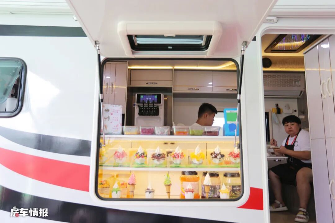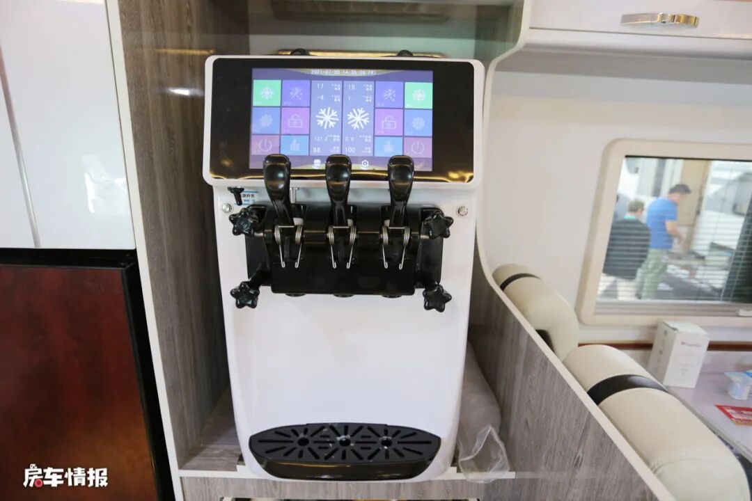 车身外侧也配置了遮阳棚、储物舱、水电接驳口等房车标配,唯一区分于家用房车的设计就是在乘客门的后方带有一个大尺寸的冰淇淋展示柜,白天对外销售时就可以打开翻板展示橱窗,晚上则可以关闭翻板保护车厢内部的隐私。