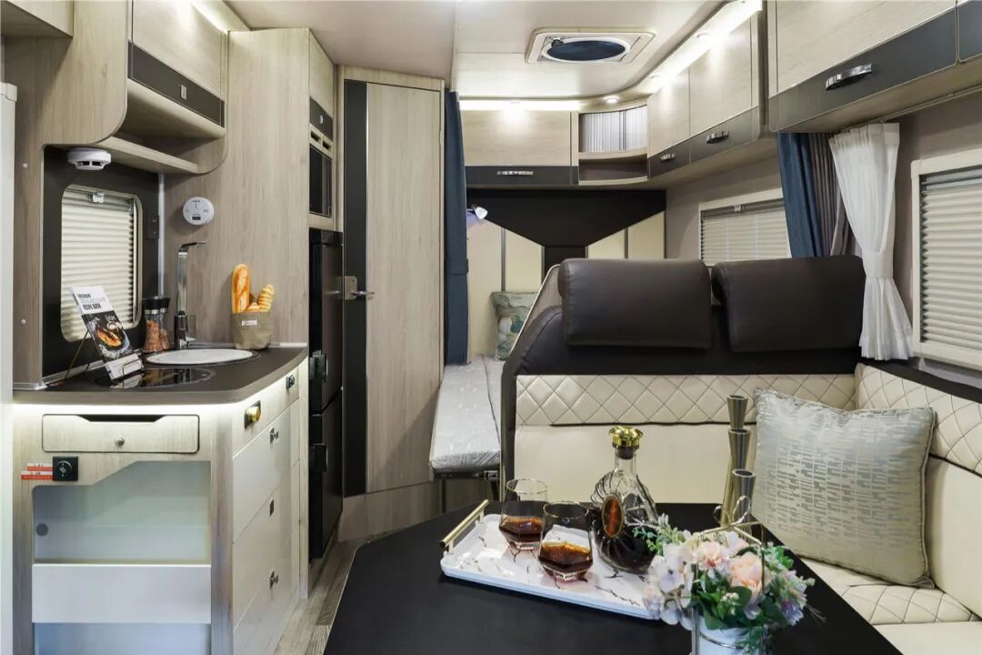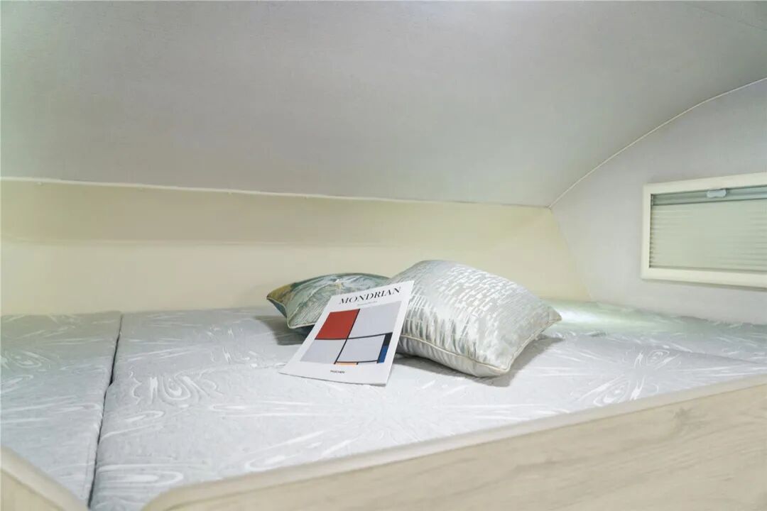 内饰布局上,从前到后依次是驾驶区、会客区、厨房区、卫生间区和休息区。会客区设计了L型沙发卡座,可升降餐桌,驻车休息时,可以将升降桌放下,形成一个单人床。在沙发卡座的对面,设计了一个单人小沙发,与会客厅形成了闭环。额头床依旧是2300*1400mm的尺寸,带爬梯,可方便上下床。