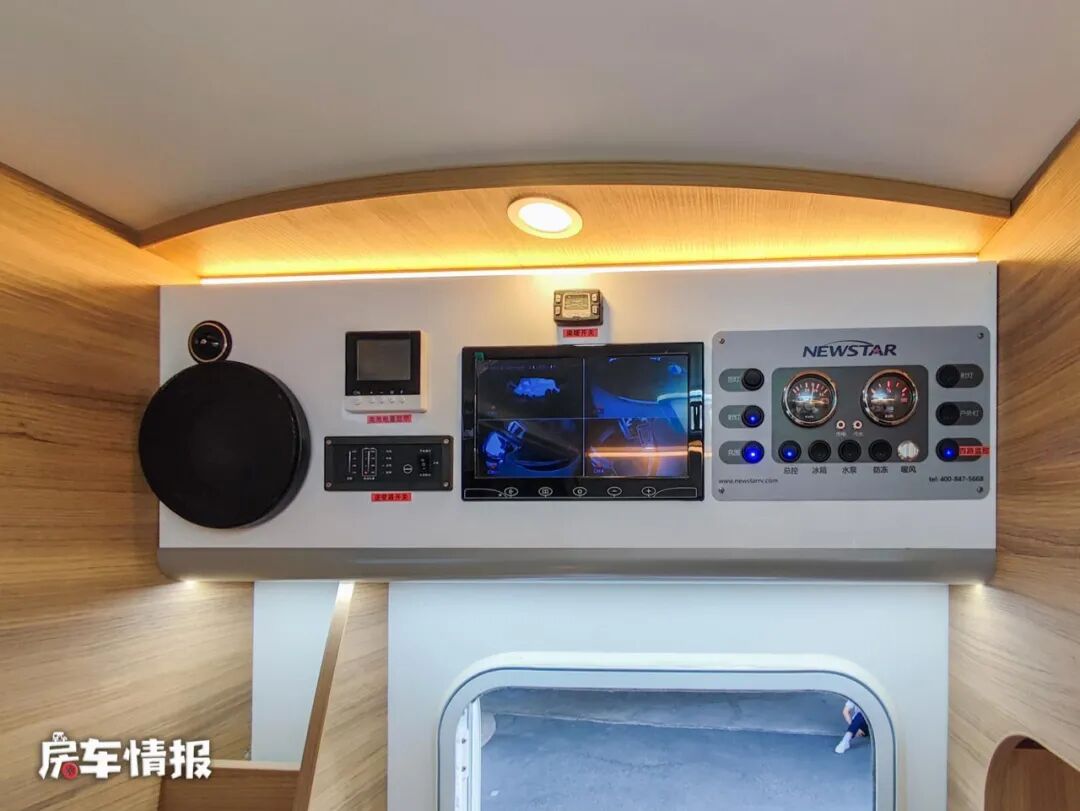 电路上,这款房车搭载了一台3000W的逆变器,匹配24V 600Ah的锂电池,同时在顶部还配备了1200W的太阳能板;水路上则提供了200L的净水箱和70L的污水箱,整体的水电容量还是非常充足的,可以做到出行无忧,另外全车还提供了家用变频空调以及燃油热水暖风系统,可以保证车内的良好居住环境。