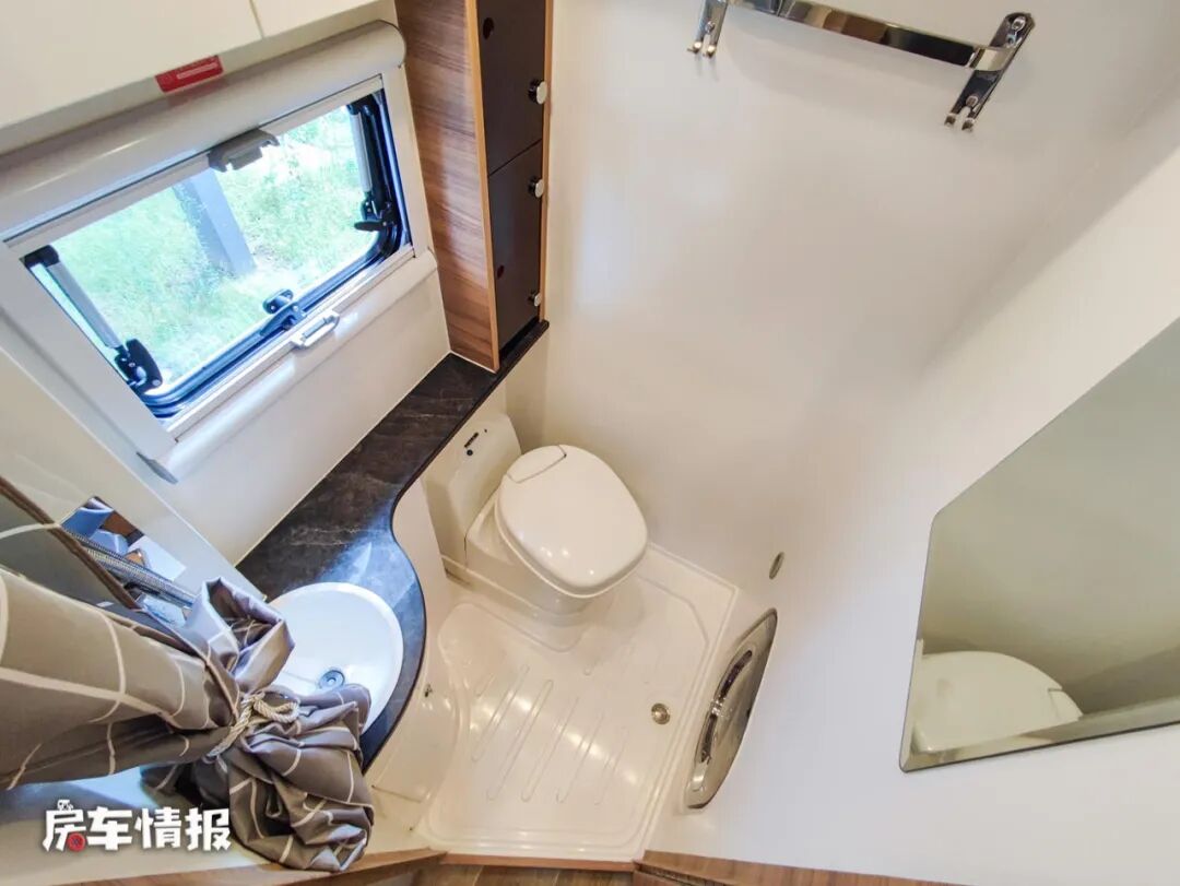 整车的卫浴间在尾床的旁边,内部空间整体来说还算宽敞,配备有盒式马桶、洗手池、淋浴系统、梳妆镜和洗衣机等,可以满足平日出行的洗漱需求。