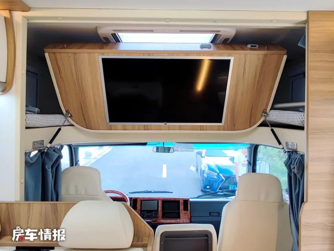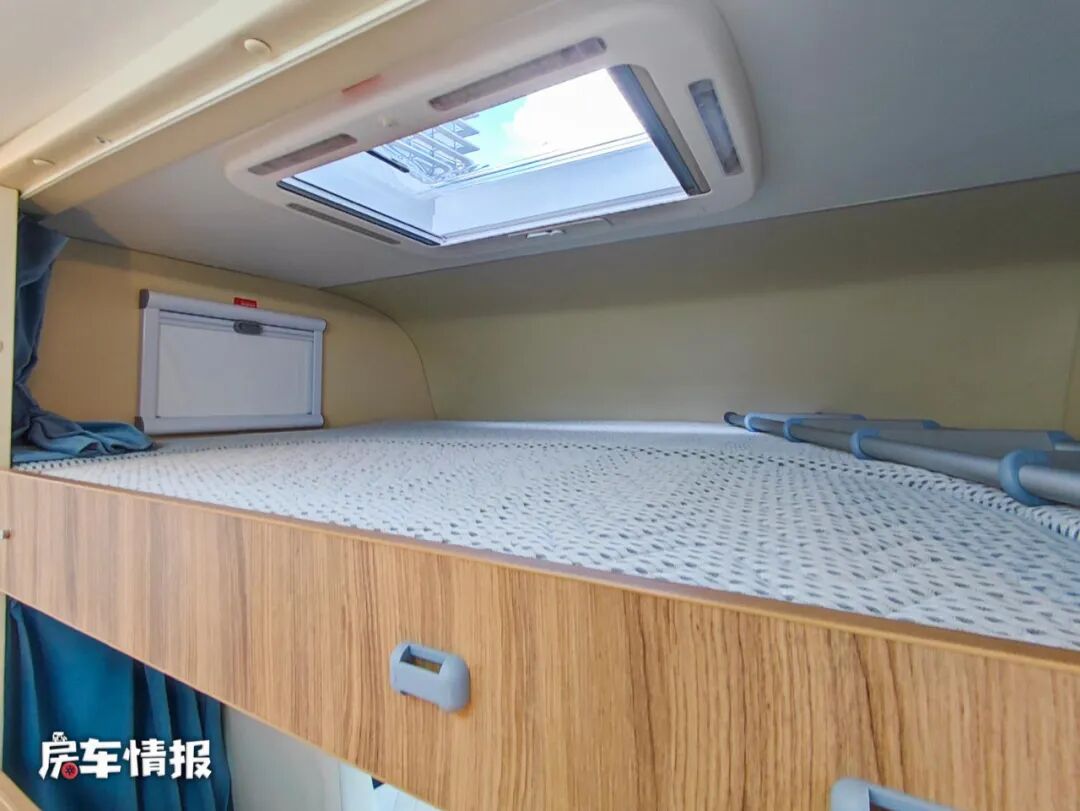 除去尾床和沙发床之外,在前方驾驶室上方的额头区内还提供了一张额头床,平时也能够提供休息睡觉的地方,额头区三面环窗,既保证了此区域的采光度同时还可以通风使用。