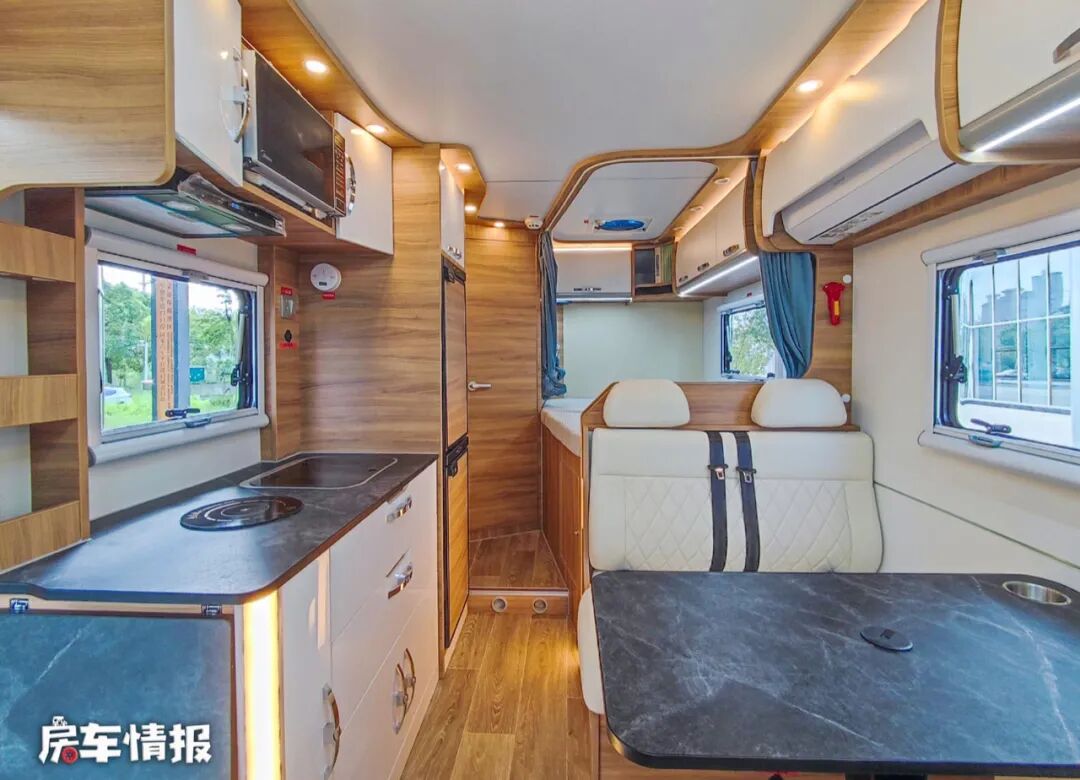 乘客门后方是全车的厨房区,台面上提供了带盖的洗菜池和单眼燃气灶,左侧还设计 可拓展的小桌板以便平时备菜使用,上方带有一台抽油烟机,可以缓解油烟带来的问题,此外上方还提供了一台微波炉。