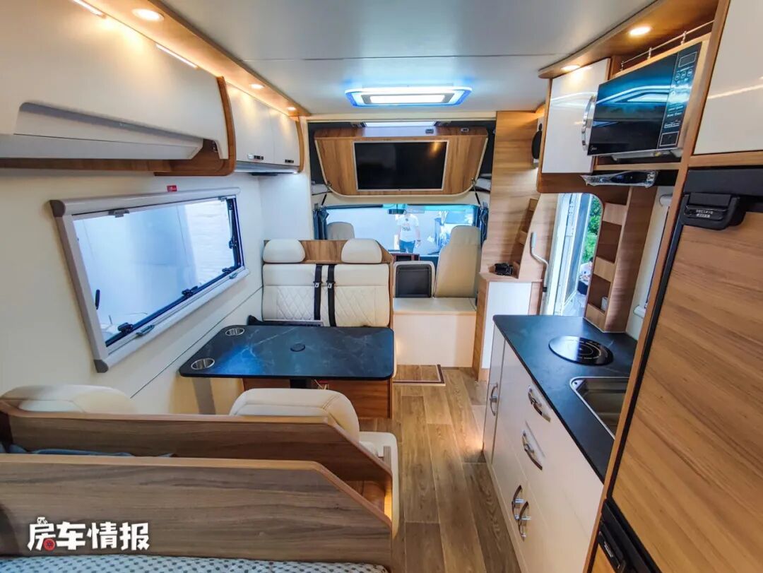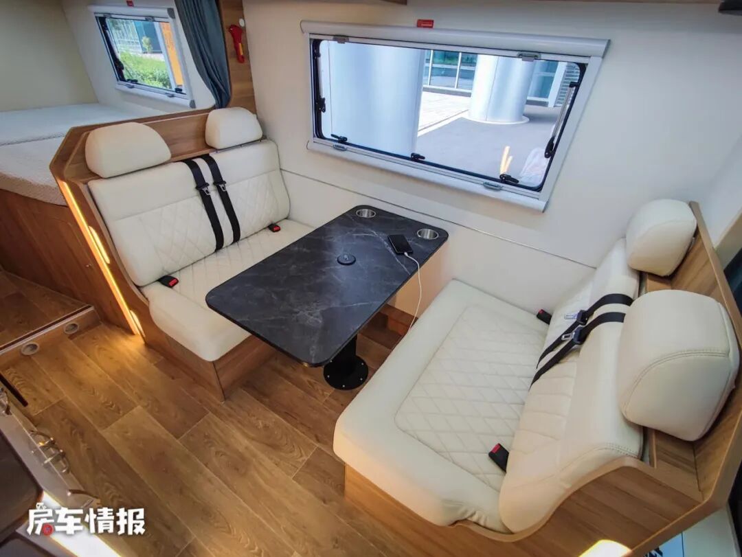 会客区还是采用了四人对卡座和升降餐桌的模式,座椅全部采用皮质软包的工艺,提升了整体的乘坐感受,并且配备了四条安全带,结合一主二副的驾驶座椅设计,所以整车在行驶过程中最多可以乘坐7个人。顶部还提供了储物吊柜,可以存放平时的一些日用品,拿取也比较方便。