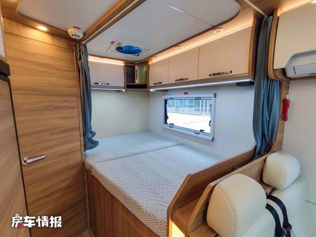 这款房车的休息区是采用了纵置双人床的设计,整体尺寸为1900*1300mm,可以容纳两名成年人休息使用,床头处提供了小夜灯和充电接口,上方则配备了一台家用变频空调,另外在顶部还提供了储物吊柜,可以存放一些平时常穿的衣物,拿取的时候也比较顺手。