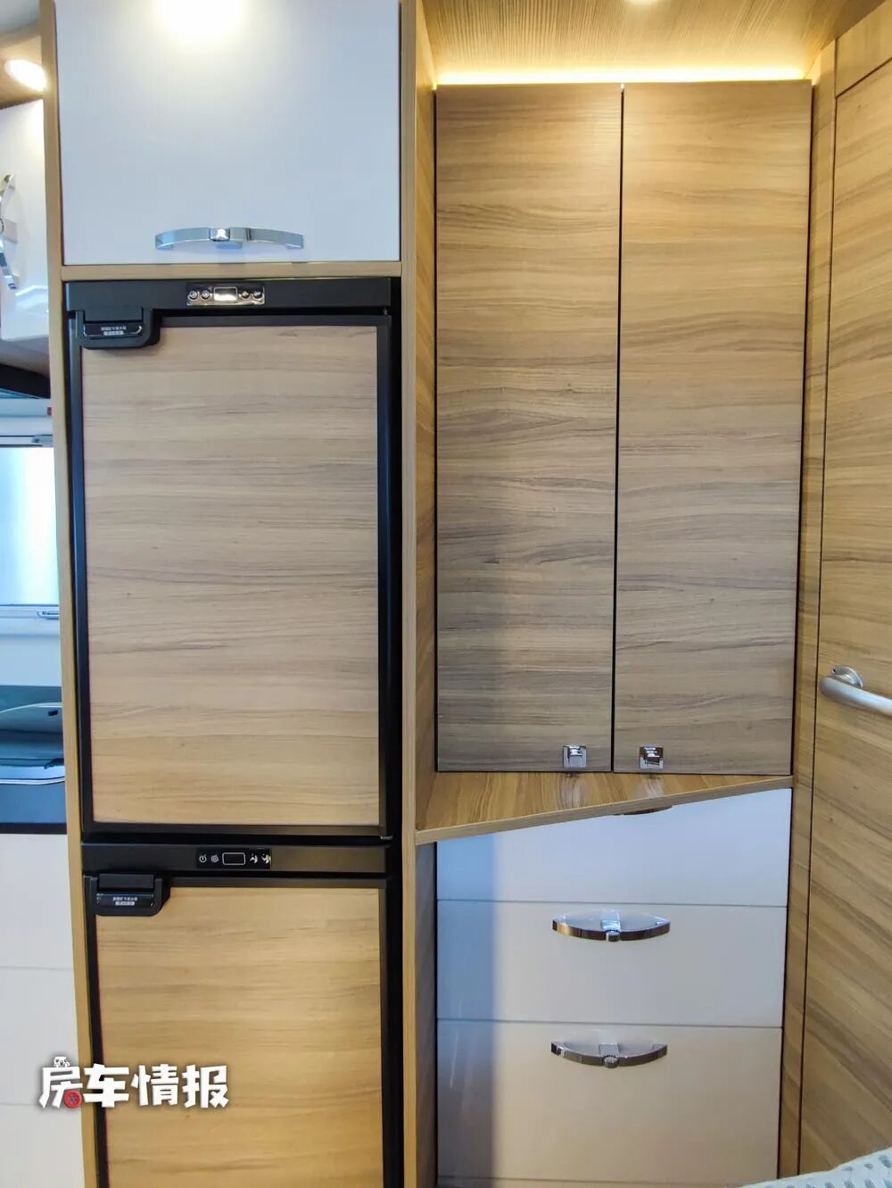 厨房操作台的后方放置了一台152L上下双开门的冰箱,整体的厨用设施还是比较完善的,能够满足出行的烹饪需求。而冰箱的上方和后方则提供了大量的储物空间,提升了整车的储物能力,带有氛围灯的设计,也方便也夜晚使用。
