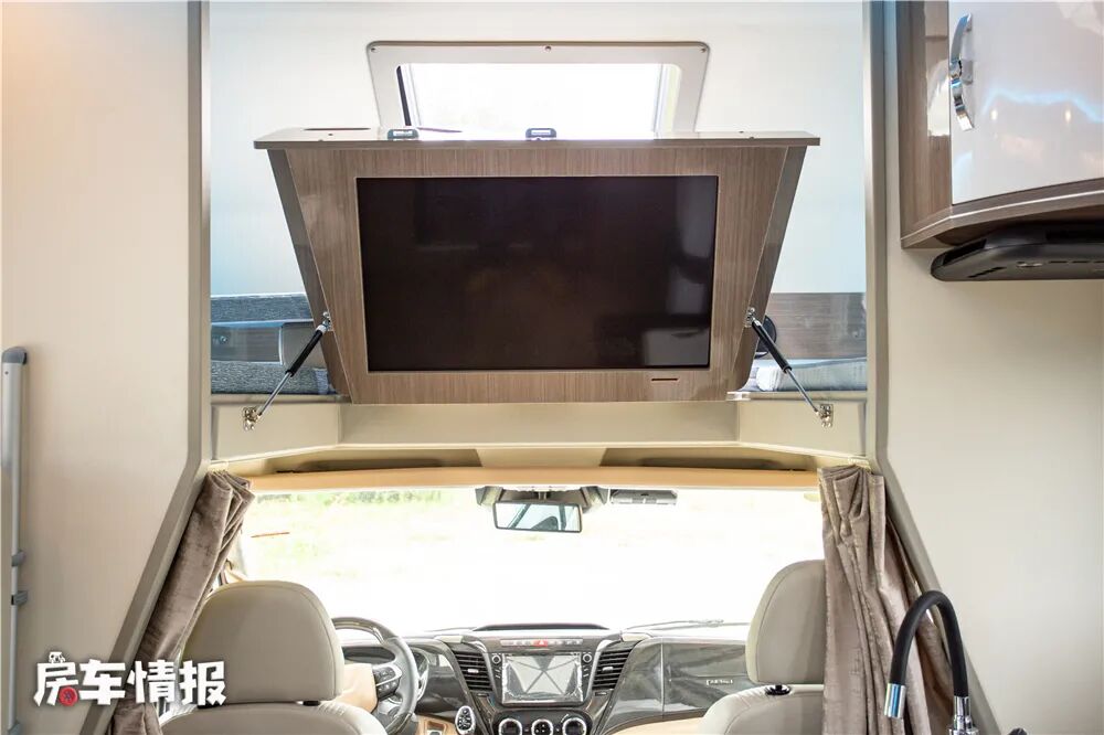 掀起床板,下方隐藏着一台32寸液晶电视,便于在旅行中观看自己喜欢的电视节目。