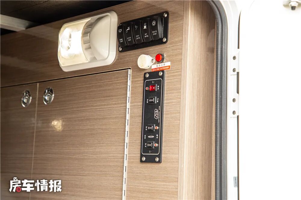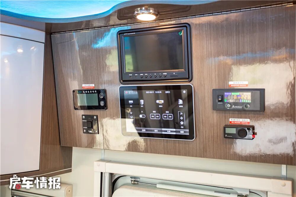 中门顶部则是车内水电的控制区域,可以控制车内灯光、暖气、发电机、拓展等设备,另外这里还提供了车外监控器,可以查看车外情况。