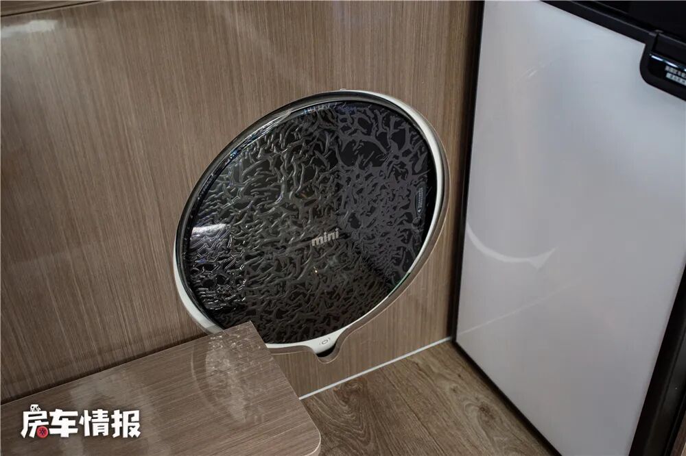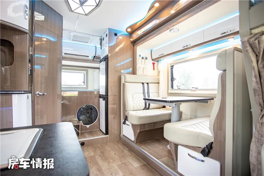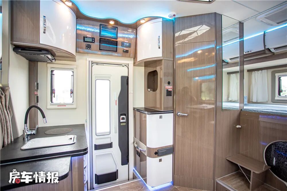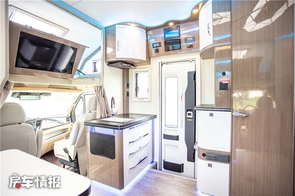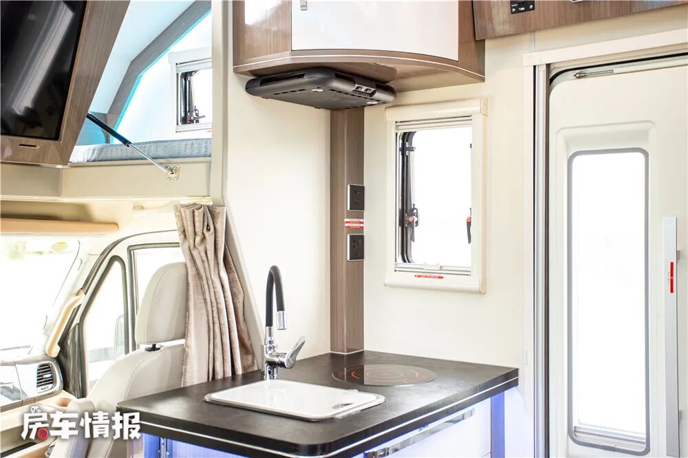 说到食物,这款车的车内厨房设计的也比较有意思,不同于以往双拓展车型的厨房位于中门后方,这款车把车内厨房设置在了中门前方、副驾驶后方的位置,如此带来的好处就是厨房整体操作台的尺寸比较大,使用起来比较顺手。