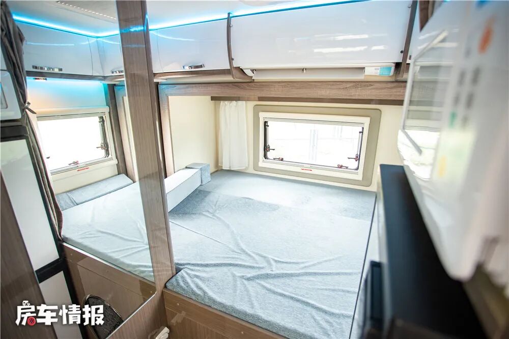 位于驾驶室顶部依然提供了一张额头双人床,尺寸达到了2200*1200mm,同样可以睡下2名成年人,并且由于车顶部平直的造型,使得额头床的垂直空间也挺不错,睡在内外侧都不会有压抑感。