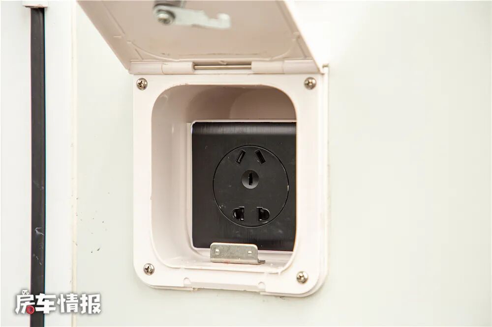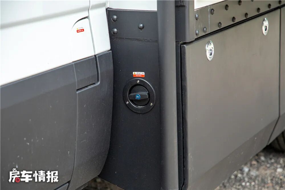 车身左侧提供了一个汽油箱加注口,这里是为独立发电机所准备的,有了发电机,即便是没有外接电源、车内电池没电的情况下,依然可以保证车内电器的正常使用。