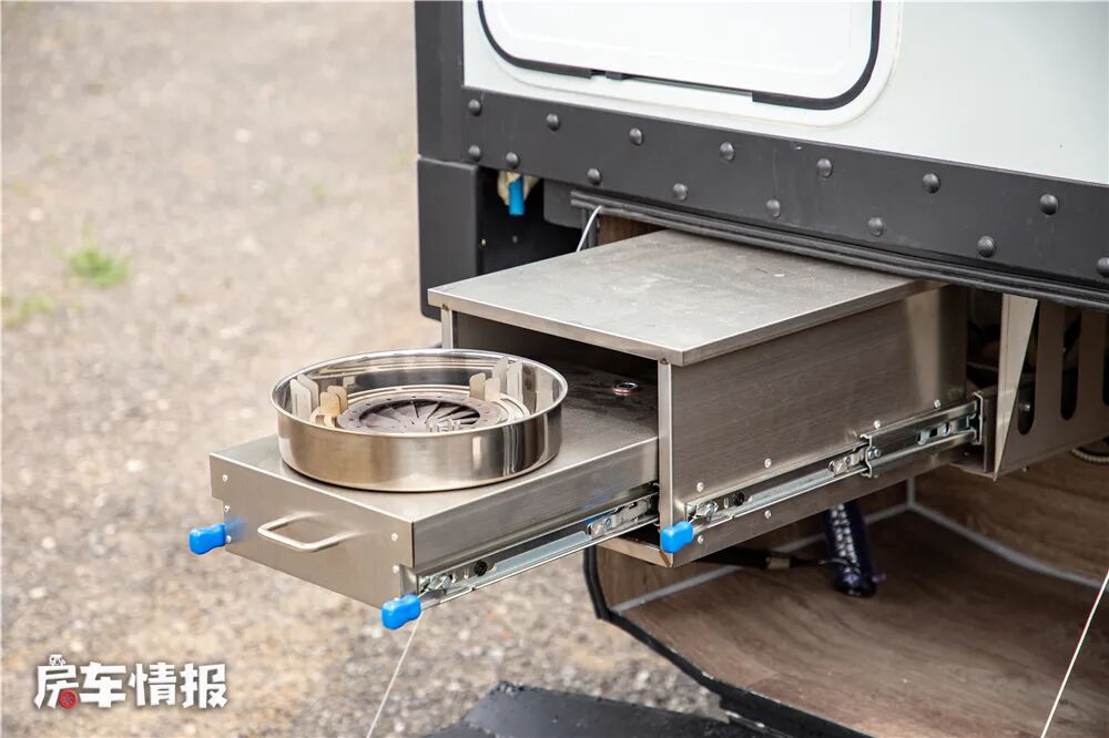 车内厨房提供了抽油烟机、电磁炉、洗菜池、储物抽屉等设备,当车外不能够使用炉灶的时候,也可以在车内做点简餐。
